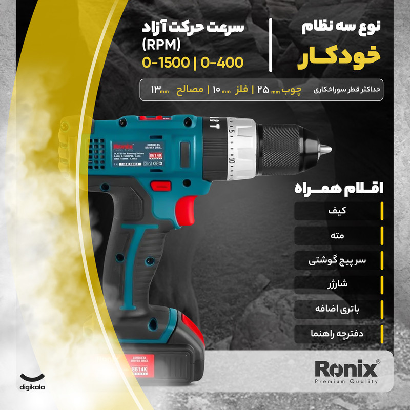 | اقلام همراه کالا | کیف , شارژر , باتری اضافه , دفترچهی راهنما , مته , سر پیچ گوشتی |