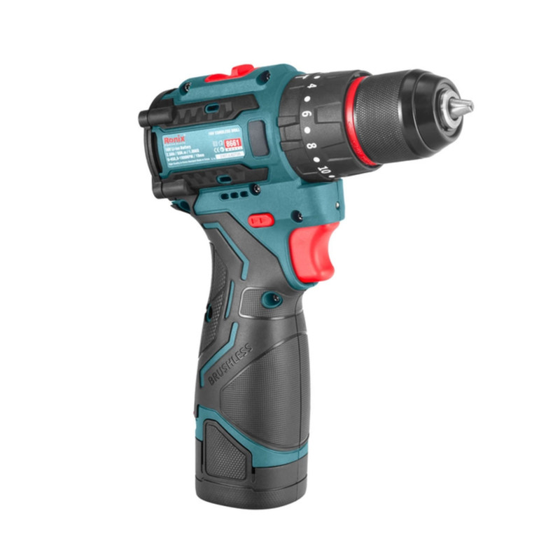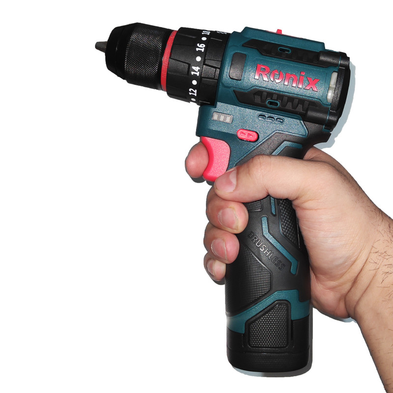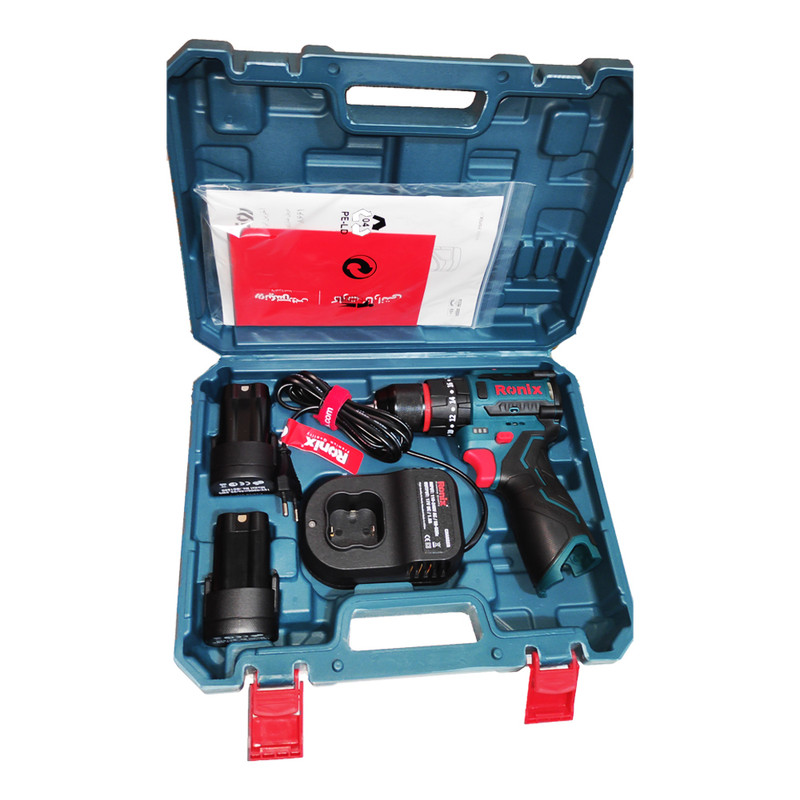 دریل چکشی شارژی براشلس 16 ولت رونیکس دارای دو عدد باتری و یک شارژر و جعبه BMC می باشد