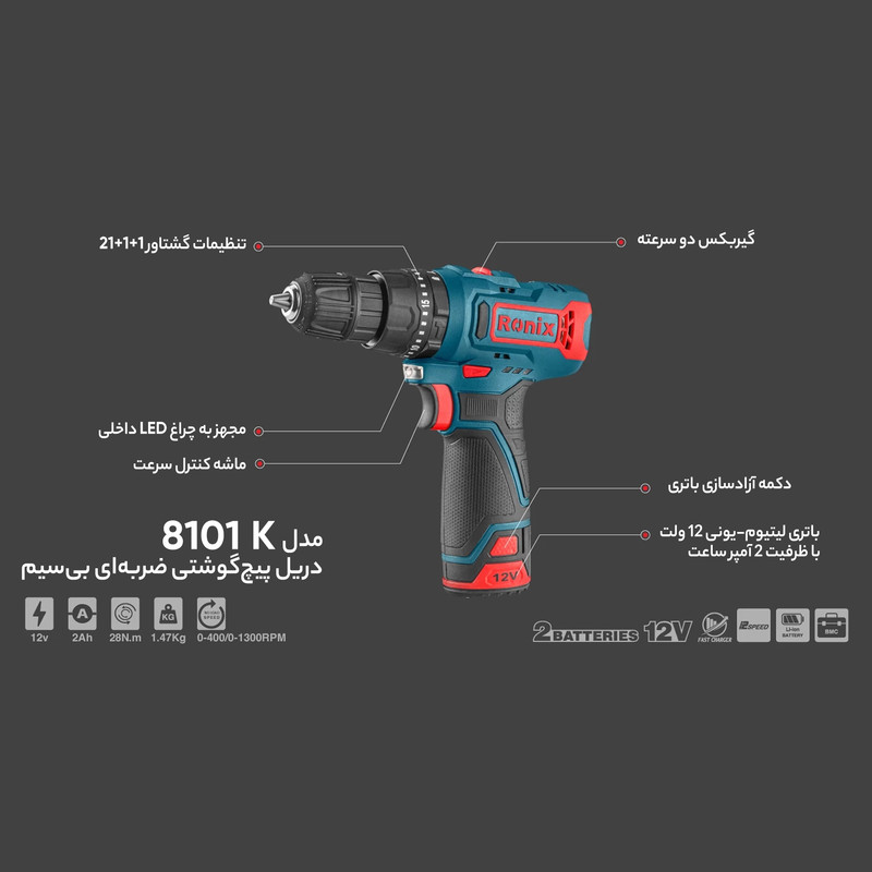 | ویژگیهای دریل | سیستم گردش چپگرد , سیستم گردش راستگرد , قابلیت کنترل سرعت |