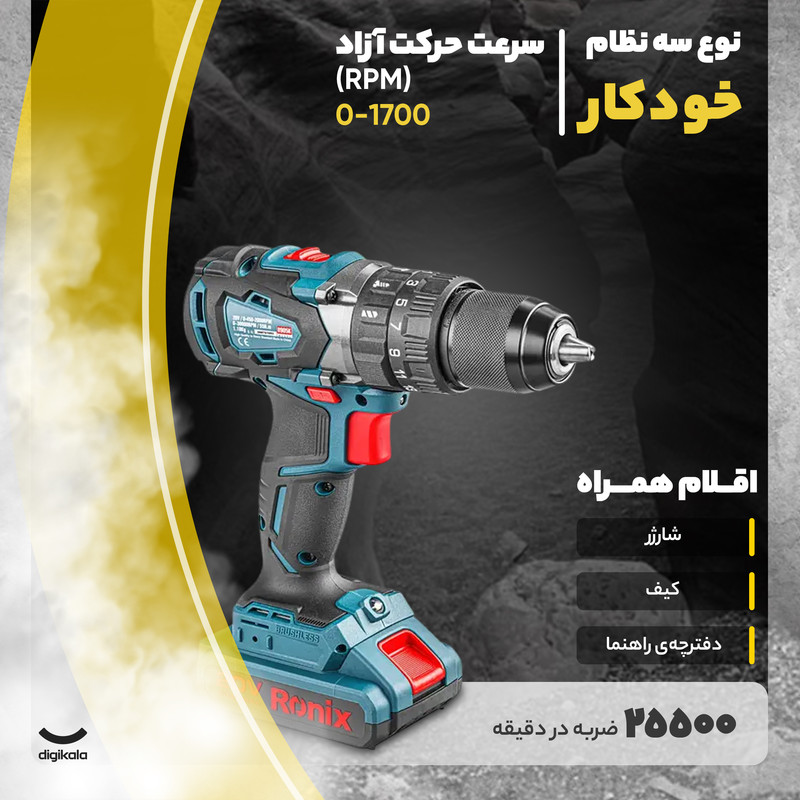 | سایر توضیحات | - دریل پرقدرت با قابلیت عملکرد در سه حالت مجزا شامل سوراخکاری، سوراخکاری چکشی و پیچگوشتی - مجهز به موتور براشلس ضد آب با عملکرد عالی و طول عمر بالا - دارای بدنهای ارگونومیک، بسیار سبک و کوچک با استحکام فوقالعاده - مجهز به کلاچ با قابلیت تنظیم گشتاور در 21حالت مختلف، برای جلوگیری از ورود آسیب به سطح کار - دارای حداکثر گشتاور 45 نیوتنمتر با قدرتی عالی و عملکردی بینظیر - قابل تنظیم در دو سرعت متفاوت جهت استفاده در سطوح مختلف - دارای حداکثر تعداد ضربه در حالت چکشی برای نفوذ آسان به سختترین سطوح - مجهز به پوسته گیربکس فلزی مستحکم با طول عمر بالا جهت بهرهگیری در فعالیتهای پرفشار - دارای طراحی منحصربفرد بدنه با روکشی از جنس لاستیک باکیفیت، مقاوم در برابر انواع ضربات و سقوط از دست کاربر - نوع بسته بندی: کیف برزنتی رونیکس - حداکثر گشتاور 45 نیوتنمتر |