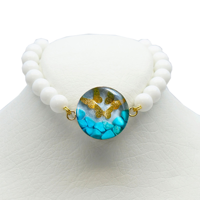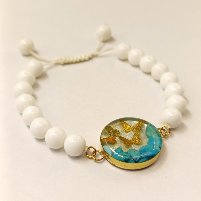 آویز دایرهای دستبند حاوی سنگهای فیروزهای طبیعی است که در کنار سه پروانه ظریف از ورق طلا جلوهای منحصربهفرد و درخشان ایجاد کردهاند. برای حفظ دوام و براقیت، سطح آویز با رزین شفاف محافظت شده و پشت آن از برنج ضد حساسیت ساخته شده است که در برابر تغییر رنگ مقاوم بوده و تنها در صورت تماس با مواد شوینده یا شیمیایی دچار آسیب میشود.