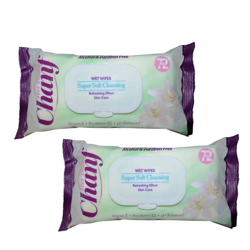 این مجموعه شامل دو بسته 72 عددی دستمال مرطوب چانف می باشدکه فاقد الکل و پارابن است و دارای ویتامین Eو B5 می باشد دستمال مرطوب چانف بدون دخالت دست تولید شده است