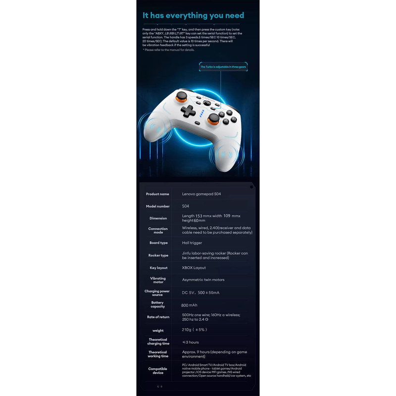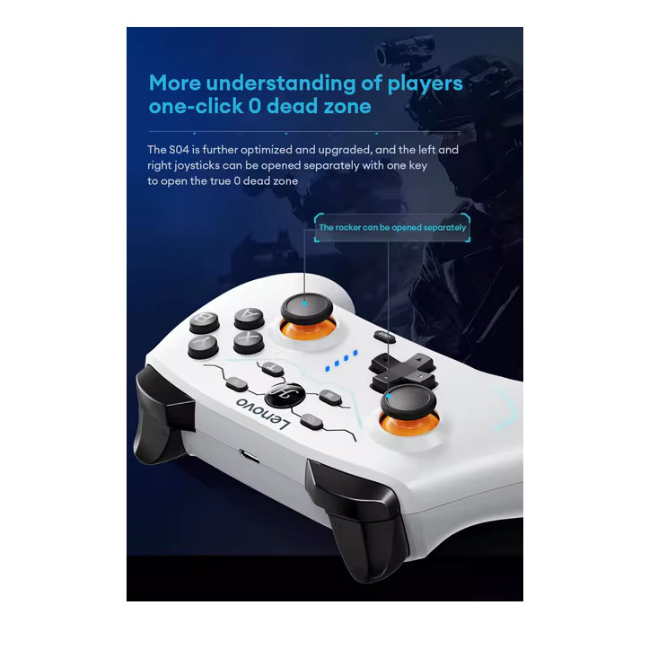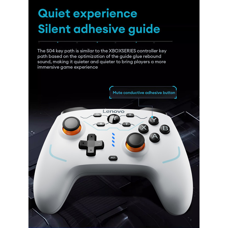 دسته بازی مدل S04 از برند Lenovo یک گیم پد به روز و حرفه ای است که با دارا بودن متریال بسیار با کیفیت و سنسور های دقیق ، خود را از سایر محصولات مشابه در بازار دنیا متمایز نموده است. این دسته دارای بلوتوث بوده و قابلیت اتصال به تبلت ، موبایل و ... را نیز دارد. همچنین دانگل گیرنده USB نیز برای اتصال به کامپیوتر داخل بسته بندی قرار گرفته است