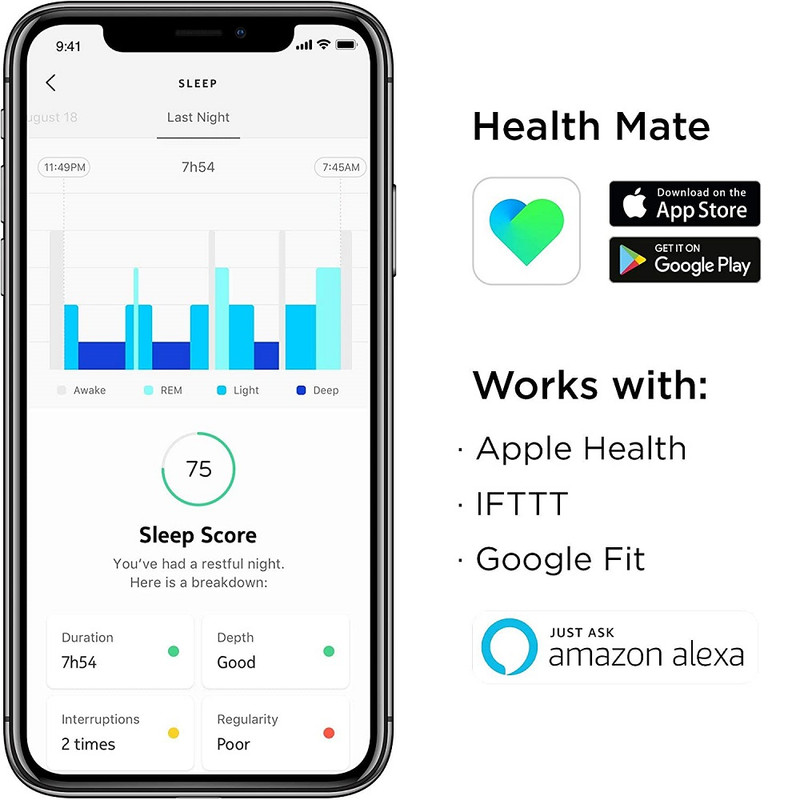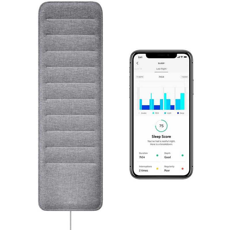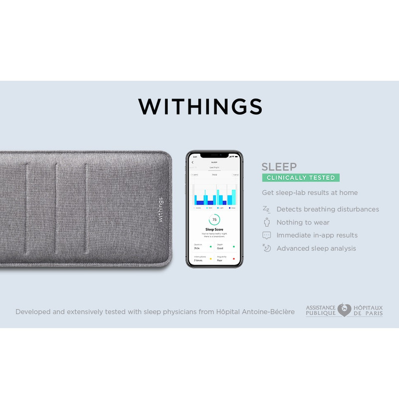 سایر توضیحات Sleep Analyzer پارامترهای سلامتی شما را در زمان واقعی ثبت و محاسبه می کند تا خواب شما را بفهمد و داده های سلامت دقیق را ارائه دهد. ضربان قلب :هر بار که قلب شما می تپد، یک موج مکانیکی را در بدن شما به حرکت در می آورد که به طور مداوم با دقت بالا توسط سنسور پنوماتیک اندازه گیری می شود. نفس كشيدن :Sleep Analyzer سیگنال حرکت شما را فیلتر می کند تا میزان تنفس شما را در طول شب استخراج کند. جنبش :حرکات بدن شما امواج مکانیکی تولید می کند که توسط سنسور پنوماتیک گرفته می شود. با دقت کالیبره شده است. به طور گسترده آزمایش شده است Sleep Analyzer با همکاری پزشکان خواب از Hôpital Béclère در پاریس توسعه یافته است و به طور گسترده در برابر داده های به دست آمده توسط تجزیه و تحلیل پلی سومنوگرافی (PSG)، استاندارد طلایی تشخیص خواب آزمایش شده است. تشخیص خروپف تعداد اپیزودهای خروپف و مدت زمان آنها را پیگیری کنید. در این برنامه، درباره الگوهای خروپف و آنچه ممکن است بر آنها تأثیر بگذارد بیشتر بیاموزید. ردیابی خواب پیشرفته - چرخه های خواب، نمره خواب و تشخیص خروپف ردیابی اختلالات تنفسی - وقفه‌های الگوی خواب را ببینید که می‌تواند به بازیابی خواب آسیب برساند. بینش های آزمایشگاه خواب - با پزشکان خواب توسعه یافته و از نظر بالینی تأیید شده است ضربان قلب خواب - ضربان قلب خود را به طور مداوم در تمام طول شب پیگیری کنید چیزی برای پوشیدن نیست - نصب آسان یک بار در زیر تشک، سازگار با بیشتر تشک ها WAKE TO فوری نتایج درون برنامه ای - از طریق Wi-Fi همه داده ها را در برنامه رایگان Health Mate بیدار کنید دفتر خاطرات خواب قابل اشتراک گذاری - با به اشتراک گذاشتن یک دفتر خاطرات خواب که به طور خودکار با پزشک خود تولید می شود، در مورد خواب خود تصمیم گیری کنید. بیدار شوید تا نتایج فوری درون برنامه را دریافت کنید نتایج خود را به طور خودکار در برنامه رایگان Health Mate (iOS و Android) از طریق همگام‌سازی خودکار Wi-Fi پیدا کنید. داده های ارزشمندی را ارائه می دهد که می تواند در طول ویزیت پزشک استفاده شود یا به راحتی از طریق PDF با ارائه دهنده مراقبت های بهداشتی شما به اشتراک گذاشته شود. راه اندازی آسان راه اندازی آسان یکباره زیر تشک باعث می شود که خواب بدون زحمت در زندگی شما جا بیفتد. Withings Sleep با بیشتر تشک ها (فنر، لاتکس، فوم و مموری فوم از ضخامت 10 تا 45 سانتی متر) سازگار است. محیط خواب تقویت شده سناریوهای اتوماسیون خانه هوشمند را فقط با داخل و خارج شدن از رختخواب ایجاد کنید. از طریق یکپارچه سازی IFTTT، Sleep می تواند به عنوان یک سوئیچ برای کنترل چراغ ها، ترموستات و موارد دیگر عمل کند.