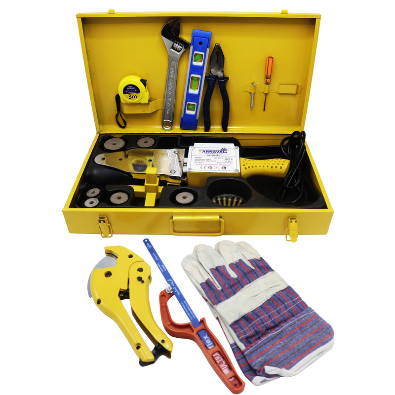 | اقلام همراه | - 1 عدد جعبه فلزی بسیار مستحکم با دستگیره برای حمل راحت و اسان - 1 عدد انبر دست - 1 عدد اچار فرانسه سایز 10 اینچ (250 میلیمتر) - 1 عدد دستکش ضد برش - 1 عدد تراز - 6 عدد لقمه اتو به سایز : 2 عدد:20 . 2 عدد:25 . 32 و 40 میلی متر به همراه پیچ - 1 عدد پیچ گوشتی چهارسو - 1 عدد الن - 1 عدد قیچی لوله بر اتومات با بهترین کیفیت - 1 عدد متر 3 متری - 1 عدد کمان اره اهن بر - 1 عدد پایه نگهدارنده فلزی |
