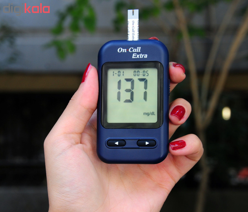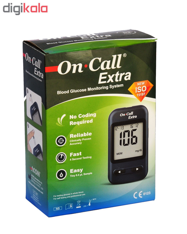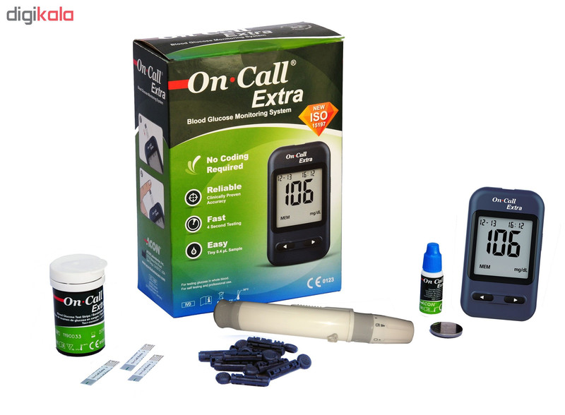 دستگاه تست قند خون «On.Call Extra» ساخت کمپانی «ایکان» (Acon) دارای 300 حافظه و قابلیت میانگینگیری از نتایج است. انرژی دستگاه از یک عدد باتری سکهای CR2023 تأمین میشود که تا 12 ماه یا حدود 1000 تست عمر کارکرد دارد. برای خونگیری از نوک انگشت باید از قلم لنست که همراه دستگاه ارائه شده استفاده کرد، این دستگاه برای اندازهگیری دقیق قند خون فقط به 0.4 میکرولیتر خون نیاز دارد. هنگامی که نوار تست داخل شیار دستگاه فرو میرود دستگاه به شکل خودکار روشن میشود. با قرار دادن یک قطره خون روی نوار، 4 ثانیه طول میکشد تا نتیجهی تست روی صفحه ظاهر شود. نتیجهی تست به همراه تاریخ و زمان آن داخل یکی از 300 حافظهی دستگاه ذخیره میشود. On.Call Extra دارای قابلیت میانگینگیری از نتایج است و میتواند میانگین 3روز الی 3 ماه اخیر را محاسبه کرده و نمایش دهد. پس از پایان تست با استفاده از شاسی اجکتور تعبیه شده در کنار دستگاه نوار مصرفشده بیرون می آید، پس از 5 ثانیه دستگاه خاموش میشود. داخل جعبه علاوه بر خود دستگاه، قلم لنست، 10 عدد سوزن،10 عدد نوار، محلول کنترل و دفترچه راهنما فارسی وجود دارد که همهی اینها داخل یک کیف پارچهای عرضه میشوند. به طور خلاصه دستگاه تست قند خون On.Call Extra دارای 300 حافظه، قابلیت میانگینگیری از نتایج در بازههای زمانی مختلف، نمایش نتیجه در 4 ثانیه و قلم لنست با قابلیت خونگیری از سایر نقاط بدن بوده و برای اندازهگیری دقیق قند خون به 0.4 میکرولیتر خون نیاز دارد.