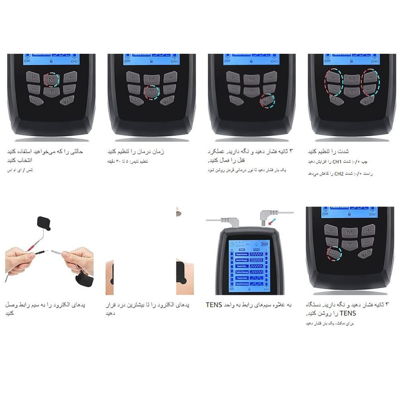 | ملاحظات | سوال ۱. آیا میتوان از دو حالت تغذیه واحد TENS با هم استفاده کرد؟ به عنوان مثال: وقتی دستگاه به باتریهای ۳*AA مجهز است، از TYPE-C برای تغذیه مستقیم استفاده کنید. الف) دستگاه TENS میتواند همزمان از هر دو حالت قدرت استفاده کند. اما ما استفاده از هر دو را توصیه نمیکنیم. سوال ۲. چگونه باید از نور قرمز درمانی استفاده کرد؟ الف) دکمه کنترل چراغ قرمز LED را برای مدت کوتاهی فشار دهید، چراغ قرمز LED روشن/خاموش میشود. محدوده طول موج چراغ قرمز LED بین ۶۲۰ تا ۶۸۰ نانومتر است. اگر باتری کم باشد، چراغ قرمز LED برای خروجی درمان ضعیف یا ناپایدار میشود. توصیه میشود از چراغ قرمز LED برای درمان با منبع تغذیه USB-C استفاده شود، زیرا چراغ قرمز LED انرژی زیادی از باتری مصرف میکند. س۳: آیا میتوانم هنگام استفاده، حالتها را تغییر دهم؟ الف) حالتها را میتوان در حین استفاده تغییر داد. با این حال، قبل از تغییر حالت، باید شدت کانالی که باز شده است را به صفر تنظیم مجدد کنید و سپس حالت را تغییر دهید. اگر مستقیماً حالت را بدون بازگشت به صفر تغییر دهید، قدرت نسبتاً بالایی وجود خواهد داشت. برای ایمنی شما، توصیه میکنیم حالتها را تغییر دهید. شدت را روی ۰ تنظیم کنید. سوال ۴: چگونه میتوان عمر پدهای الکترود را افزایش داد؟ الف) قبل از استفاده، پوست باید تمیز و خشک باشد. پوست کثیف یا چرب از چسبندگی الکترود جلوگیری میکند. استفاده از چند قطره آب پس از استفاده، طول عمر پدها را افزایش میدهد و اجازه دهید به طور طبیعی خشک شوند. پدها را روی فیلم پلاستیکی قرار دهید تا رطوبت ژل پس از استفاده حفظ شود. هشدارها: ● قبل از قرار دادن یا برداشتن الکترودها، دستگاه TENS/EMS را خاموش کنید ● برای بیمارانی که بیماری قلبی، نارسایی قلبی یا آریتمی شناخته شده دارند، استفاده نشود زیرا ممکن است بر شرایط این بیماریها تأثیر منفی بگذارد. ● در دوران بارداری استفاده نشود، مگر با تجویز پزشک ● نور قرمز LED را به چشمها نتابانید ● از دستگاههای تنس روی زخمهای باز یا بثورات پوستی، یا روی نواحی متورم، قرمز، عفونی یا ملتهب استفاده نکنید. ● از دستگاه TENS روی چشمها/دهان/صورت، اطراف گردن یا هر ناحیهای از گلو استفاده نکنید. ● هنگام خواب استفاده نشود |