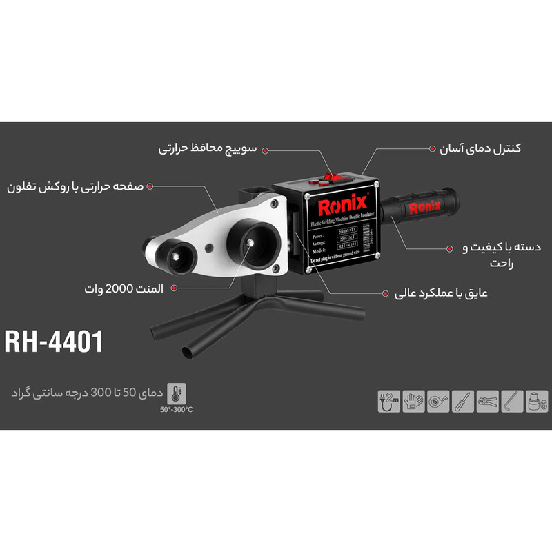 امروزه استفاده از لولههای فلزی منسوخ شده است بهجای آن از لولههای پلیمری استفاده میکنند. لولههای پلیمری به لولههایی از جنس پلاستیک گفته میشود که انواع و قطرهای مختلفی دارند. ازجملهی گونههای لولههای پلیمری میتوان به PE، PB و PP-R اشاره کرد. از دلایلی که باعث بروز این مورد شده است میتوان به عمر بیشتر لولههای پلاستیکی، حفظ انرژی و انجام لولهکشی در زمان کمتر اشاره کرد. برای انجام لولهکشی با این نوع لولهها از دستگاه جوشی نظیر دستگاه جوش لولهی پلیمری استفاده میکنند. مدل RH-4401 نمونهآی از این دستگاه است که توسط شرکت «رونیکس» (Ronix) تولید میشود. این محصول با برق شهری (230 ولت) کار میکند و توان آن به 2000 وات میرسد. دو المنت حرارتی برای این مدل در نظر گرفتهشده است. پس از رسیدن حرارت سوکتها به مقدار تنظیمشده، المنتها بهصورت خودکار خاموش میشوند. در کارتن این محصول و در کنار این دستگاه، علاوه بر پایه فلزی مخصوص، یک راکت اضافی، یک آچار (برای باز کردن و بستن سوکتها)، یک متر 5 متری، یک سیم سیار و یک دستکش وجود دارد که همگی در یک کیف فلزی قرار داده شدهاند. رونیکس یکی از برندها و شرکتهای داخلی تولیدکنندهی ابزار است که در بازار و در میان شرکتهای داخلی تولیدکنندهی ابزار جایکاه مناسبی در بازار دارد. برای استفاده از دستگاه جوش لولهی پلیمری مانند مدل RH-4401، بهتر است از دستکش ایمنی استفاده کنید.