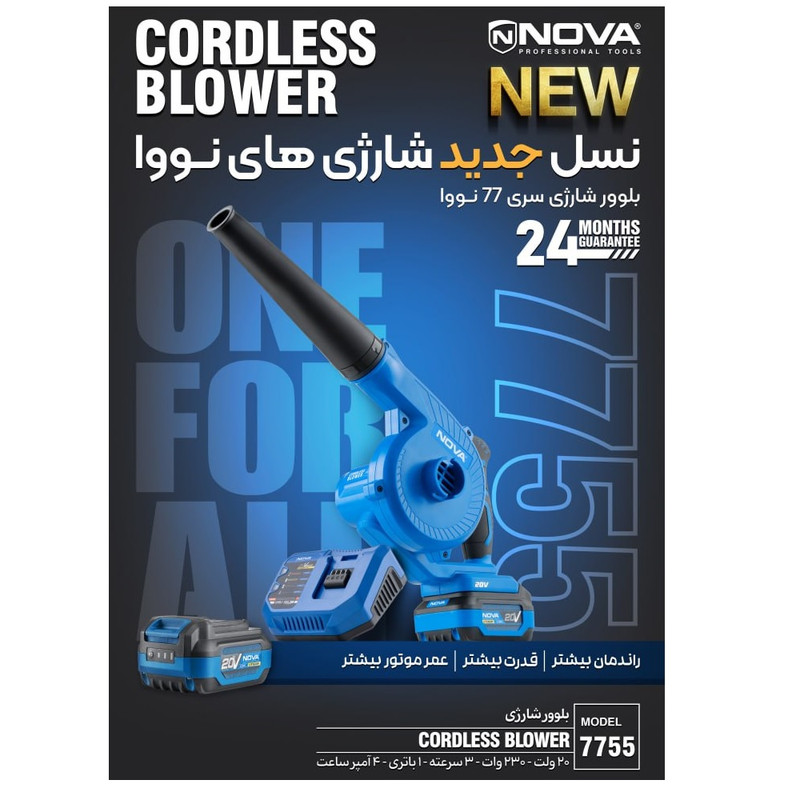 این محصول با سیستم شارژ سریع (Fast Charger) و نشانگر میزان شارژ باتری، مدیریت بهینه انرژی را تضمین میکند. باتریهای 2 آمپر ساعت و 4 آمپر ساعت سری ONE FOR ALL 77، سازگار با این دستگاه هستند و سیستم گردش هوای منحصر به فرد آن به بهبود عملکرد موتور و افزایش طول عمر دستگاه کمک میکند. در نهایت، بلوور شارژی 20 ولت نووا با عملکرد قوی و طراحی کارآمد، انتخابی مناسب برای کسانی است که به دنبال یک ابزار چندکاره با قابلیت دمندگی و مکندگی بالا هستند.