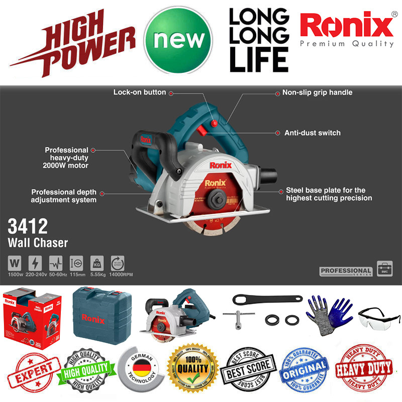 شیارزن نوعی ابزار برقی است که از قدرت برش بالا برای ایجاد شیار در دیوار برخوردار است. از این وسیله در صنعت ساختمان جهت کارهایی مانند برق‌کشی استفاده می‌شود. شیارزن برقی برای کندن مسیر عبور انواع لوله، برش کف و دیوار برای جعبه فیوز و همچنین جای لوله کاربرد دارد. این دستگاه عملیات برش را با سرعت و قدرت بالا انجام می‌دهد.شرکت های مختلف با توجه به کاربرد گسترده شیارزن‌های برقی برای تولید این دستگاه اقدام کرده‌اند. رونیکس نیز نمونه موفقی از این ابزار برقی را تولید و روانه بازار ابزار ایران کرده است. شیارزن دو تیغ 3412 رونیکس دارای موتوری پرقدرت با توان 2000 وات است که آرمیچر و بالشتک آن به وسیله‌ دستگاه‌‌های تمام‌اتوماتیک و مطابق با معتبرترین استانداردهای جهانی ساخته شده‌اند.وجود سیستم سافت استارت یا شروع نرم در ابزارآلات برقی حائز اهمیت است. این سیستم به بالابردن سطح ایمنی کاربر در هنگام راه‌اندازی دستگاه کمک می‌کند. رونیکس نیز در ساختار شیارزن دو تیغ خود با توجه به این نکته، این دستگاه را به سیستم شروع نرم مجهز کرده است تا ایمنی کاربر حفظ شود.وزن سبک و ساختار ارگونومیک دو ویژگی مهمی هستند که در هنگام انتخاب ابزارآلات مورد توجه کاربران قرار می‌گیرند. رونیکس نیز در طراحی این دستگاه به سهولت در کاربری و ساختار ارگونومیک آن توجه بسیاری کرده است. وزن سبک معادل 5.5 کیلوگرم در کنار دسته ارگونومیک D شکل آن، کاربری آسانی را به وجود آورده است. بدنه سبک و کوچک این دستگاه موجب کاهش خستگی کاربر در فعالیت‌های طولانی‌مدت می‌شود.قدرت بالای موتور از مواردی است که کاربران در هنگام تهیه ابزارآلات برقی به آن توجه می‌کنند. شیارزن دو تیغ رونیکس به یک موتور گیربکسی 2000 وات با فرکانس 50-60 هرتز و ولتاژ 240-220 ولت مجهز شده است. این موتور از آرمیچر و بالشتک‌های باکیفیت ساخته شده است و سرعت گردش آن در حالت آزاد 6000 دور در دقیقه است. دستگاه مجهز به بلبرینگ‌های ضد غبار NSK جهت افزایش طول عمر موتور است. سیستم خنک‌کننده موتور نیز به منظور بالا بردن طول عمر دستگاه تعبیه شده است.تمام موارد کیفی وفنی این دستگاه باعث شده در نوع خود بی رقیب باشد .