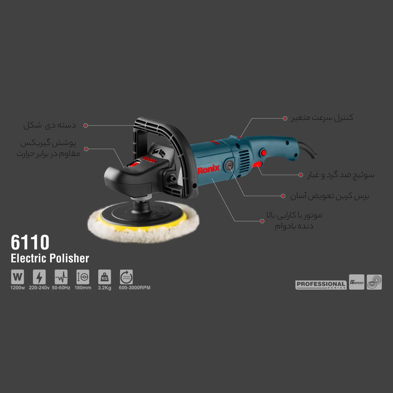 | سایر توضیحات | - موتور پر قدرت و گیربکس با دوام - قابلیت تنظیم دور در 6 حالت مختلف - همراه با صفحه آلومینیومی پولیش کاری - درپوش پلاستیکی ضد حرارت جهت سهولت در پولیش کاری |