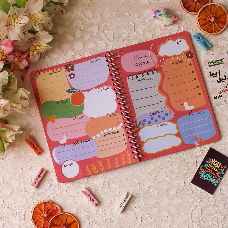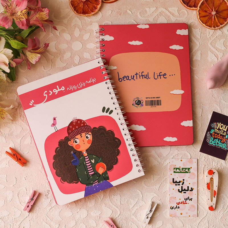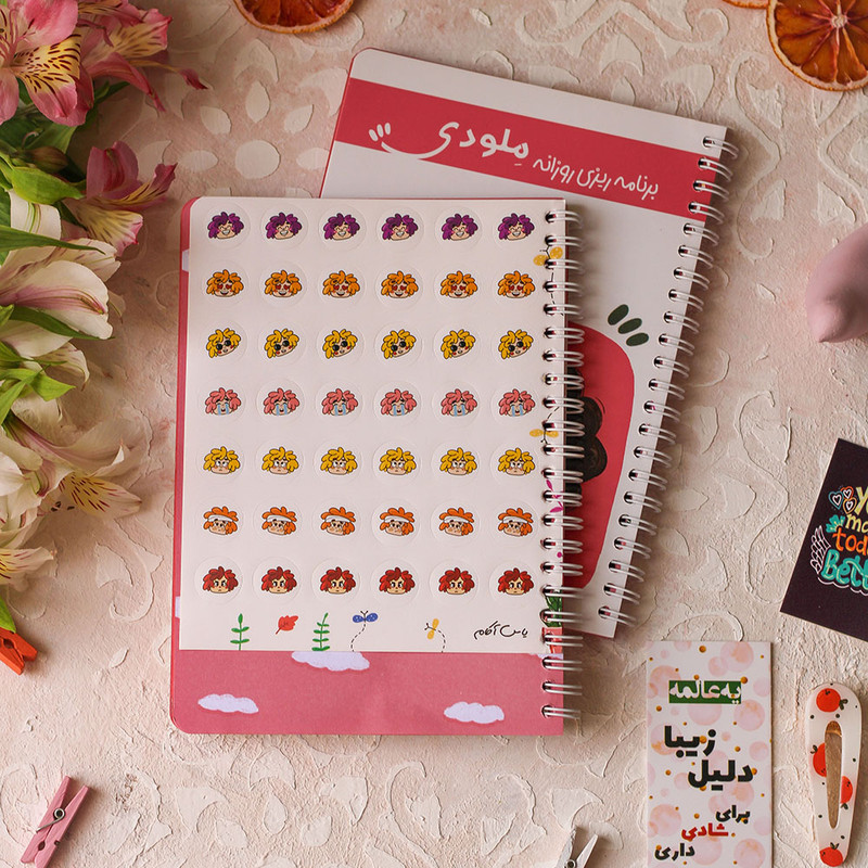 پلنر روزانه ملودی با طراحی ایرانی و کیفیت بالا به همراه 2 برگ برچسب برش خورده و دارای 80 برگ مناسب برنامه ریزی 80 روز می باشد که هر دو صفحه مختص یک روز است.
