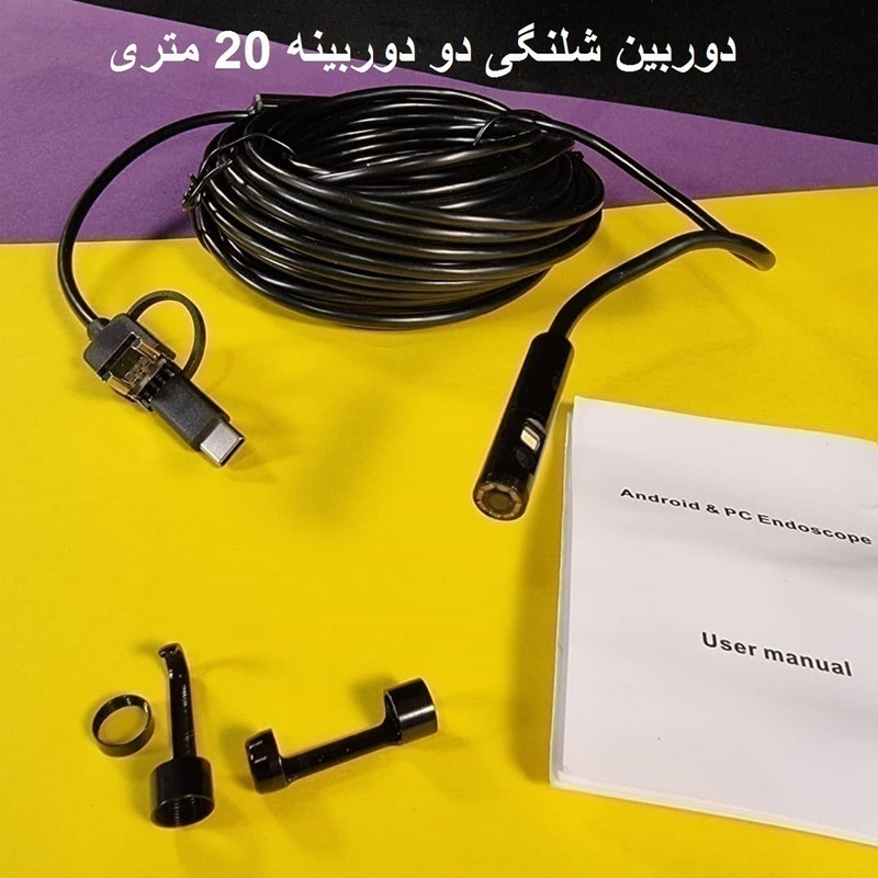 سایر توضیحاتدارای کیفیت عالی 1280×720 بصورت HD کابل انعطاف پذیر و شکل پذیر فلزی ضد آب فیلم برداری و عکس برداری دارای 6 چراغ LED در اطراف دوربین جلو و یک چراغ LED برای دوربین کناری با قابلیت تنظیم نور رنگ مشکی فرمت ویدیو AVI رزولیشن 640×480 و 720×1280 طول کابل دوربین شلنگی 20متر USB 2.0/1.1 درجه ضد آبی IP67 سیستم عامل: اندروئید و ویندوزهای xp,vista,w7,w8, mac