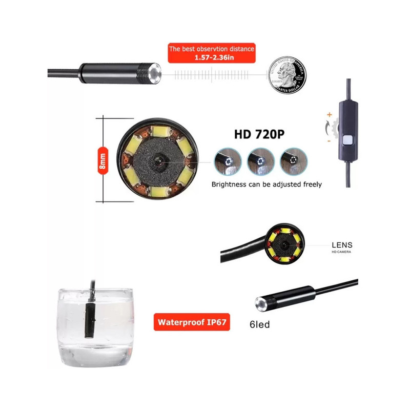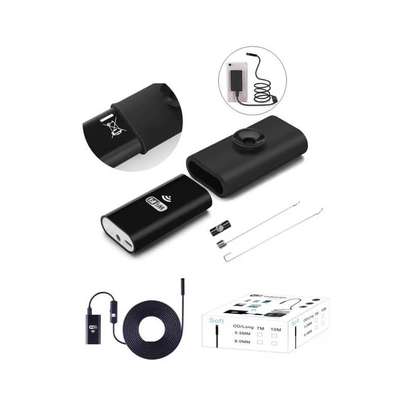 دوربین شلنگی آندوسکوپی 10 متری wifi ضد آب HD با قطر دوربین 8 میلی متر. با توجه به استفاده از سیستم ارتباط بیسیم می تواند بدون توجه به مدل دستگاه با همه انواع سیستم های عامل مثل اندروئید، IOS، ویندوز کار کند و کاربردهای بسیاری دارد ازجمله کاربردهای آن ،بررسی گوش، معاینه دهان و دندان، جستجو و نجات،مشاهده داخل خط لوله، بازرسی موتور، نظارت تصویری، بازرسی لوله فاضلاب ،بازرسی دیوار، و غیره می باشد.