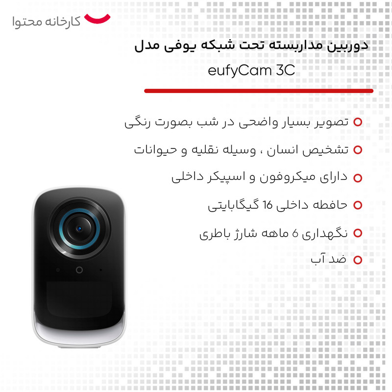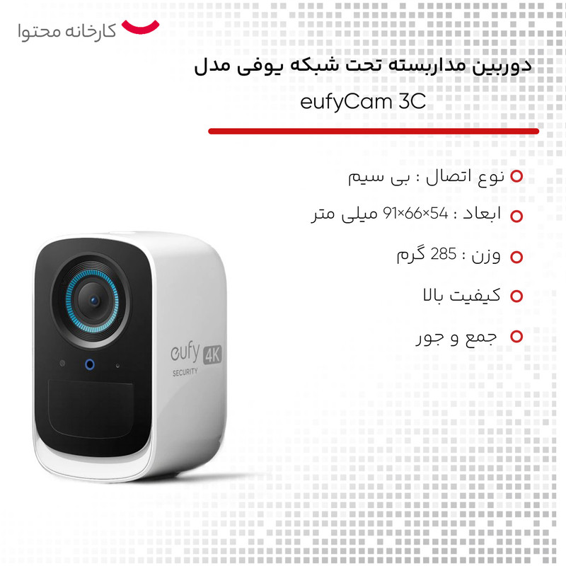 برند Eufy یک برند از زیر مجموعه انکر(ANKER) است. یکی از محصولات امنیتی آن دوربین های مداربسته EufyCam است که مدل eyfyCam 3C را با کارایی و کیفیت بالا (4K) عرضه کرده است. یکی از موارد قابل توجه دوربین های eufycam 3C ضد آب بودن است که براحتی میتوان از آن در محیط های بیرون استفاده کرد. از دیگر مزایای آن نگهداری 6 ماهه شارژ باطری میباشد که دیگر نگران تمام شدن باطری آن نباشید و هرزمان که نیازمند چک کردن تصاویر دوربین خود از راه دور بودید به راحتی از طریق برنامه داخل موبایل آن را چک نمایید. همچنین این دوربین دارای حافطه داخلی 16 گیگابایتی است که برای ضبط تصاویر 3 ماه کافی است. یکی از قابلیت های بسیار مهم دوربین های eufycam 3C تشخیص انسان ، وسیله نقلیه و حیوانان می باشد و همچنین میتوانید تصویر بسیار واضحی را در شب بصورت رنگی و وضوح بالا در شب براحتی مشاهده کنید. این دستگاه دارای میکروفون و اسپیکر داخلی برای کنترل بیشتر نیز می باشد. زمانی که صحبت از امنیت میشود جزئیات بسیار مهم است و شما با دوربین های eufycam 3C هرآنچه را که در خانه و اطراف خانه شما اتفاق می افتد را با وضوح 4k ببینید.