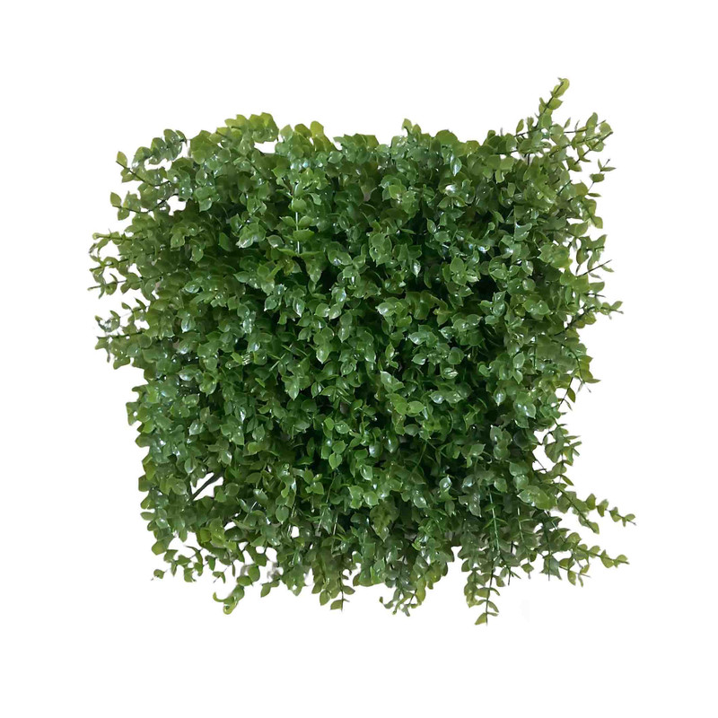 این محصول همان گونه که از نامش پیداست، ساقه و برگ هایی مشابه گیاه شمشاد دارد. تنوع ساختار برگ های این محصول باعث پدیدار گشتن یک توده سبز واقع گرایانه و پویا می شود که حس زنده بودن و نشاط را به محیط منتقل می نماید. برای انجام تزئینات تکمیلی نیز می توان گیاهان مصنوعی با اندازه های بزرگ تر و رنگ های موجود در گیاهان طبیعی را بر روی آن نصب نمود. رنگ مدل شمشادی سبز روشن و معروف به سبز زمرّد است که جلوه گیاهان بهاری و تازه روییده را تداعی می کند. کنار هم قرار گرفتن این رنگ با طیف های تیره تر رنگ سبز، موجب پدید آمدن دیوار سبز مصنوعی بسیار زیبایی می شود که نظر مثبت افراد با سلایق مختلف را جلب می نماید. جای دهی و نصب انواع دسته برگ و گل مصنوعی در میان مدل شمشادی، جلوه دوست داشتنیِ طبیعت مناطق معتدل و مرطوب را شبیه سازی می نماید. ارتفاع تاج پوشش مدل شمشادی 10 تا 11 سانتی متر و قطر هر واحد تشکیل دهنده (گل) آن 5 سانتی متر است که حجم پوششی بسیار انبوه و متراکمی را پدید می آورد. نظافت گیاهان مصنوعی بسیار آسان است و هیچ صدمه ای به دیوار سبز وارد نمی کند. اصولاً به علت قرارگیری عمودی دیوار سبز مصنوعی، گرد و غبار اندکی بر روی آن انباشته می شود. خاک و غبار نشَسته بر روی دیوار سبز را می توانیم با فشار باد دستگاه های دمَنده و گردگیرهای پَر یا نخی پاک کنیم به طوری که ظاهر دیوار سبز مثل روز اول تمیز و زیبا شود. در صورت نصب صحیح و اتصال استوار دیوار سبز مصنوعی با بستر خود و البته عدم آسیب به محیط اطراف، می توانیم با آب و با مواد شوینده خانگی به شستشوی آن بپردازیم. این پنل به شکل مربع و با ابعاد 23.5×23.5 سانتیمتر عرضه می شود که با احتساب زوائد دایره ای شکل اتصال توسط میخ به دیوار، معادل 25×25 سانتی متر معرفی می شود. در صورت نصب صحیح و اتصال استوار دیوار سبز مصنوعی با بستر خود و البته عدم آسیب به محیط اطراف، می توانیم با آب و با مواد شوینده خانگی به شستشوی آن بپردازیم. مدل شمشادی زیرمجموعه محصولات دیوار سبز مصنوعی از جنس پلی اتیلن مقاوم به نور خورشید بوده و از استاندارد UV resistant برخوردار است.