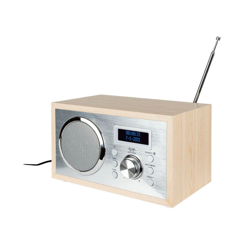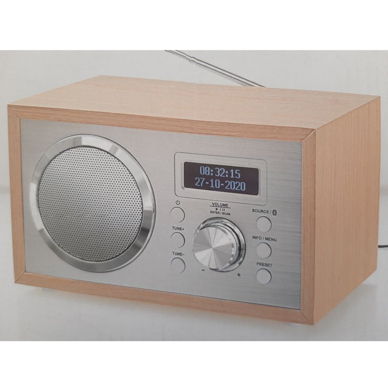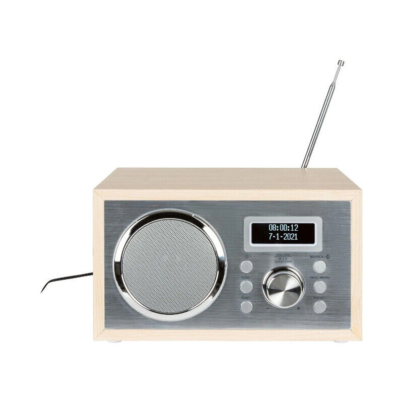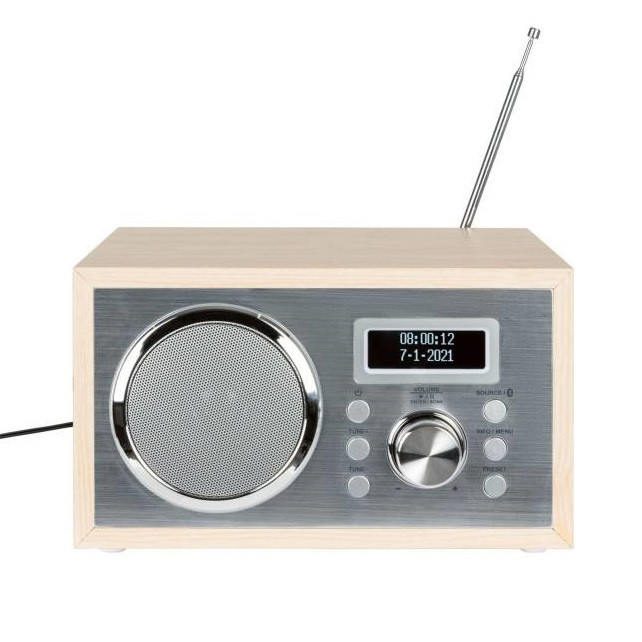 | امکانات و قابلیتها | مناسب برای اتاق نشیمن یا آشپزخانه طرز کار دقیق، جلوی آلومینیومی با کیفیت بالا، دستگیره های آلومینیومی برس خورده عملیات بسیار ساده ظاهر جذاب رادیو FM با تیونر آنالوگ و دیجیتال DAB+ امکان برنامه ریزی 20 ایستگاه صفحه نمایش LCD دو ردیفه با نور پس زمینه آنتن تلسکوپی قابل افزایش محفظه چوبی با سوراخ باس رفلکس که صدای زنگ های پایین را بهبود می بخشد بلندگوی تک برد کامل ورودی بلوتوث به شما امکان می دهد موسیقی را از تلفن هوشمند یا تبلت پخش کنید ورودی AUX برای اتصال منابع صوتی خروجی هدفون توان خروجی: 5W RMS پشتیبانی از قدرت موسیقی 10 وات UKW (FM) 87.5-108 مگاهرتز ابعاد: 227x155x136 به لطف DAB+ مقاوم در برابر آینده امکان پخش جریانی از طریق بلوتوث دزدگیر قابل تنظیم دستگاه های صوتی خارجی را می توان متصل کرد |