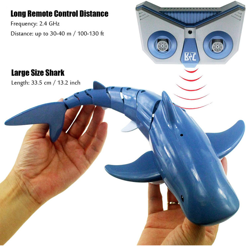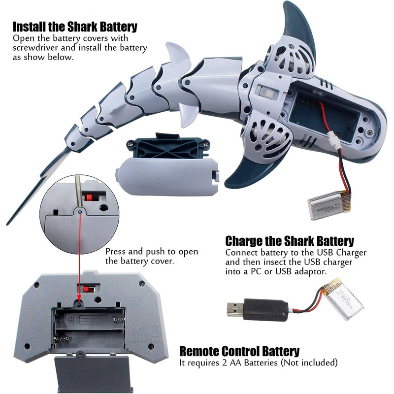 کوسه کنترلی شارژی شناگر با قابلیت شنا در آب و حرکت در جهات مختلف در آب و دارای قطعات ضد آب و دو موتور پرهای است. این کوسه به وسیله کنترل از راه دور هدایت میشود. ابعاد این اسباب بازی عبارتست از؛ ارتفاع 8.5، عرض 16 و طول 35.5 سانتیمتر. در بستهبندی این کوسه پیچ گوشتی کوچک، دو پره یدکی، پیچ یدکی، شارژر، باتری شارژی و دفترچه راهنما قرار دارد.