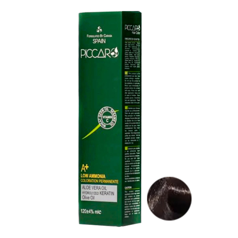 رنگ مو پیکارو حاوی کراتین , روغن کنجد , روغن بادام , روغن زیتون , ویتامین E , C , B , نرم کننده , جوانه گندم , عصاره آلوئه ورا و کراتین هیدرولیز شده می باشد که موجب آبرسانی , درخشندگی و شفافیت مو ها می شود و از خشکی و شکنندگی مو ها جلوگیری می کند. از سایر ویژگی های رنگ مو پیکارو می توان به ماندگاری و دوام طولانی و پوشش یکنواخت سفیدی مو اشاره کرد. رنگ مو پیکارو دارای حداقل میزان آمونیاک است.