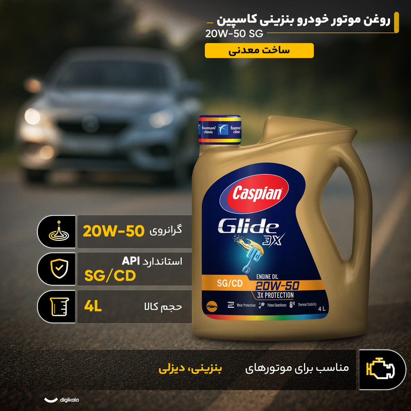 روغن موتور کاسپین چهارفصل چهار لیتری مظروف پلاستیکی 20W-50 SG، CD یک محصول با سطح کیفی API SG,API CD با روغن پایه مینرال و درجه گرانروی یا لزجیت SAE J300 20W-50 با رعایت الزامات استاندارد API SG,API CD مناسب خودروهای با سوخت بنزینی میباشد. سوپر روغن موتور مولتی گرید کاسپین با فرمولاسیون پیشرفته و بهره گیری از روغن پایه پیشرفته و همچنین مواد افزودنی درجه یک مناسب برای انواع خودروهای بنزینی مدل 2001 به بالا