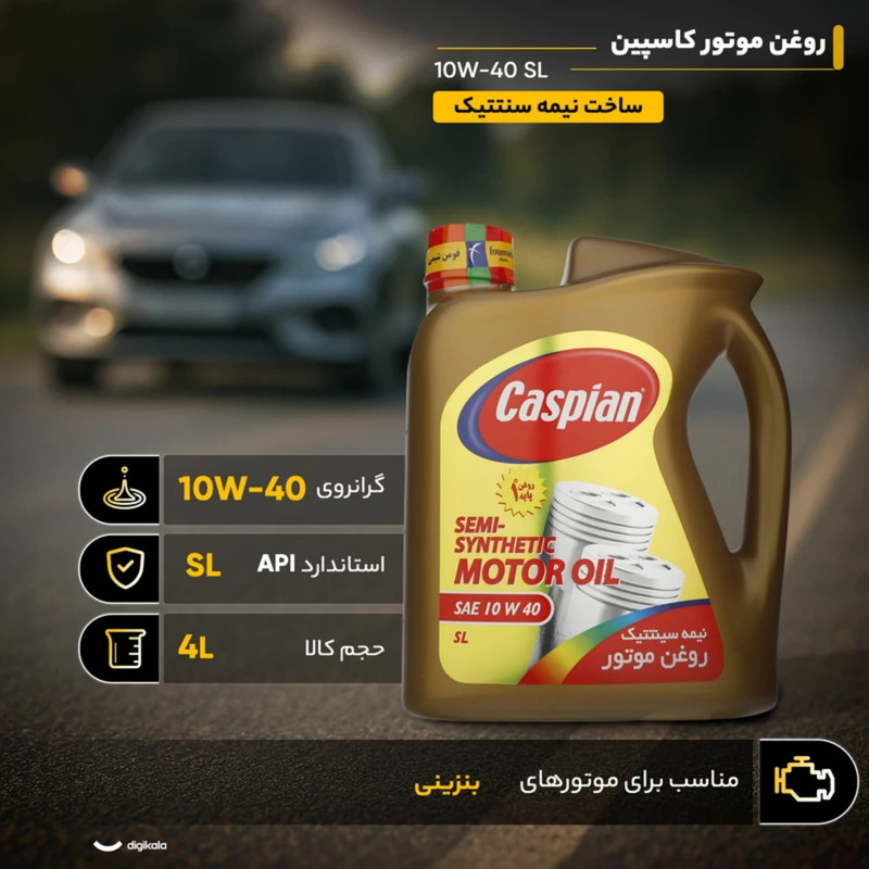 فرموله شده با روغن پایه نیمه سینتتیک و افزودنی های اورجینال اروپایی، استارت سریع و آسان موتور در هوای سرد زمسـتان، پایداری غلـظت فیلم روغن در هوای گـرم تابستان، روانی و آسانی کار موتور، صرفه جویی در مصرف سوخت، کاهش اصطکاک و استهلاک قطعات موتور و جلوگیری از رسوبات مضر، محافظ موتور در مقابل اکسیداسیون و خوردگی، تحت لیسانس شرکت کاسپین اینترنشنال انگلستان، مناسب برای خودروهای مدل 2001 به بالا. روغن موتور کاسپین نیمه سنتتیک چهار لیتری مظروف پلاستیکی 10W-40 SL یک محصول با سطح کیفی API SL با روغن پایه نیمه سینتتیک و درجه گرانروی یا لزجیت SAE J300 10W-40 با رعایت الزامات استاندارد API SL,API CF مناسب خودروهای با سوخت بنزینی میباشد.