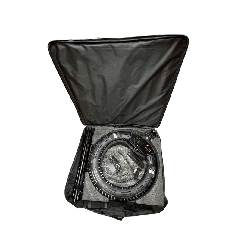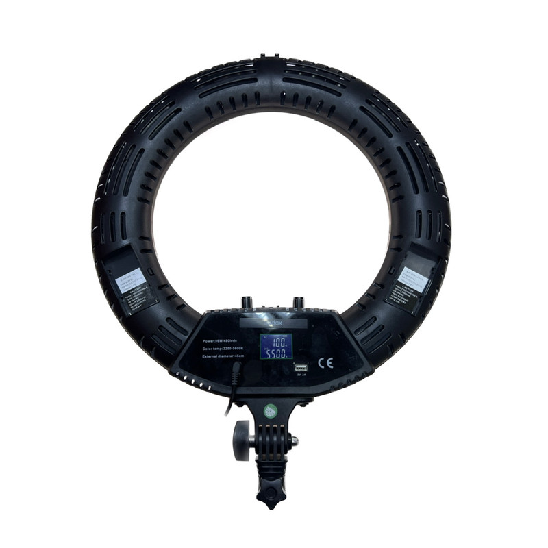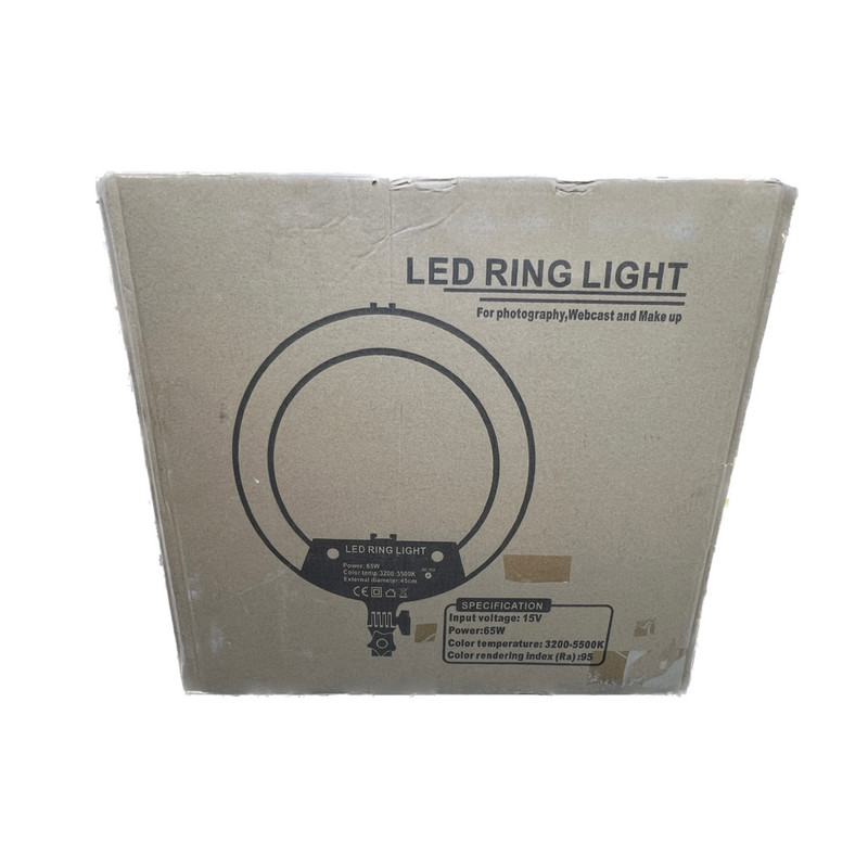 این رینگ لایت دارای قطر 45 سانت است که 65 وات توان نوردهی و دارای یک عدد ریموت کنترل ویک عدد آداپتور جهت روشن شدن ویک عدد هولدر موبایل برای نصب موبایل جهت ضبط ویدیو و عکاسی و یک عدد آینه برای میکاپ و دیدن خود در هنگام عکاسی و فیلمبرداری وهمچنین یک عدد سه پایه تاشو میباشد. این مجموعه دارای یک کیف حمل با کیفیت است که هم دستی و هم رودوشی است.
