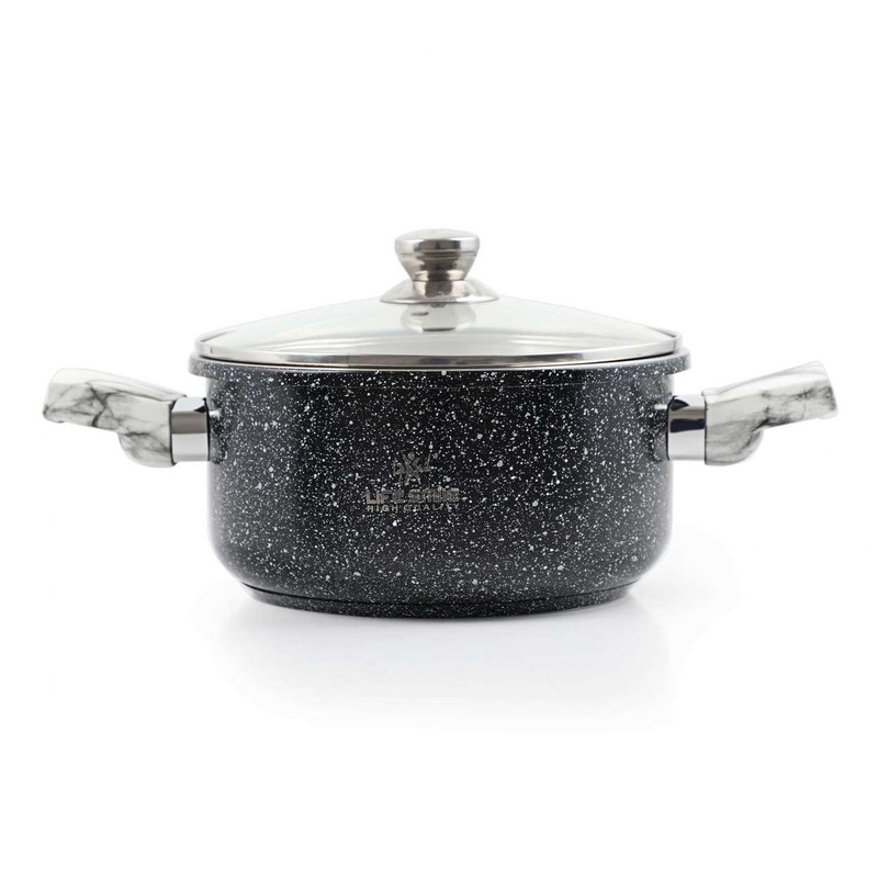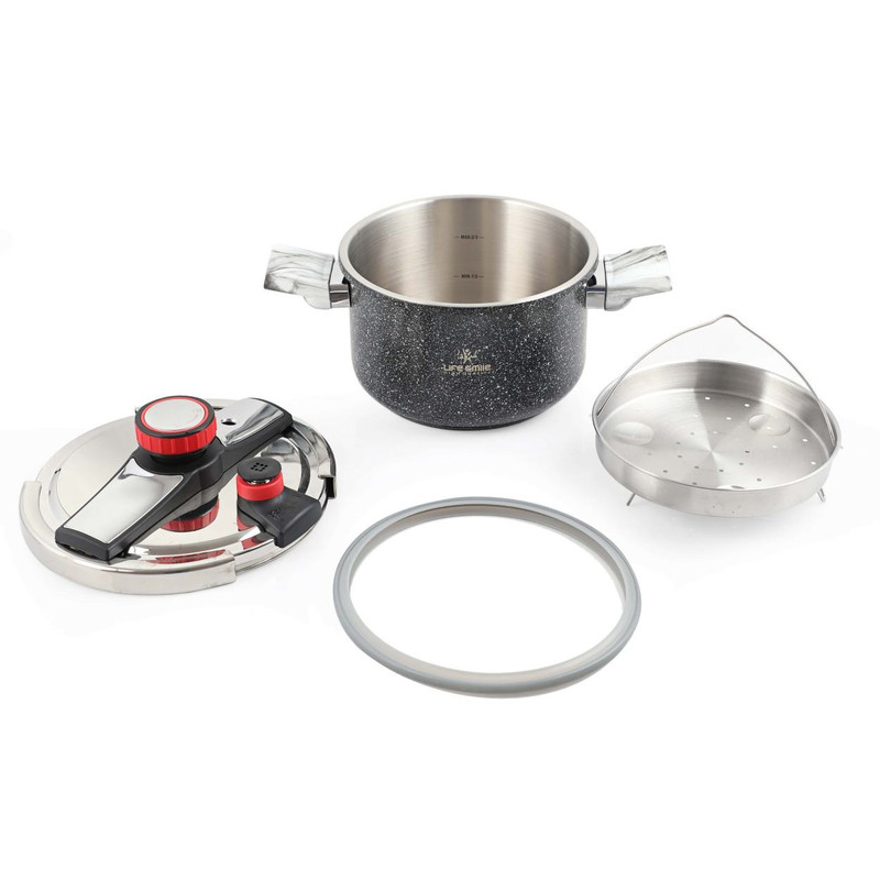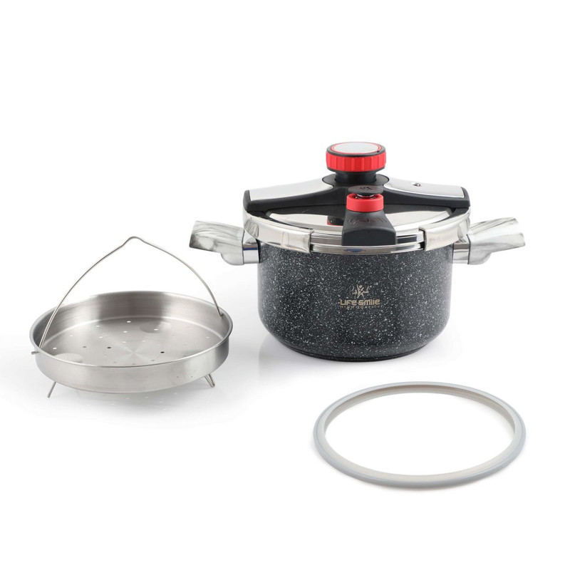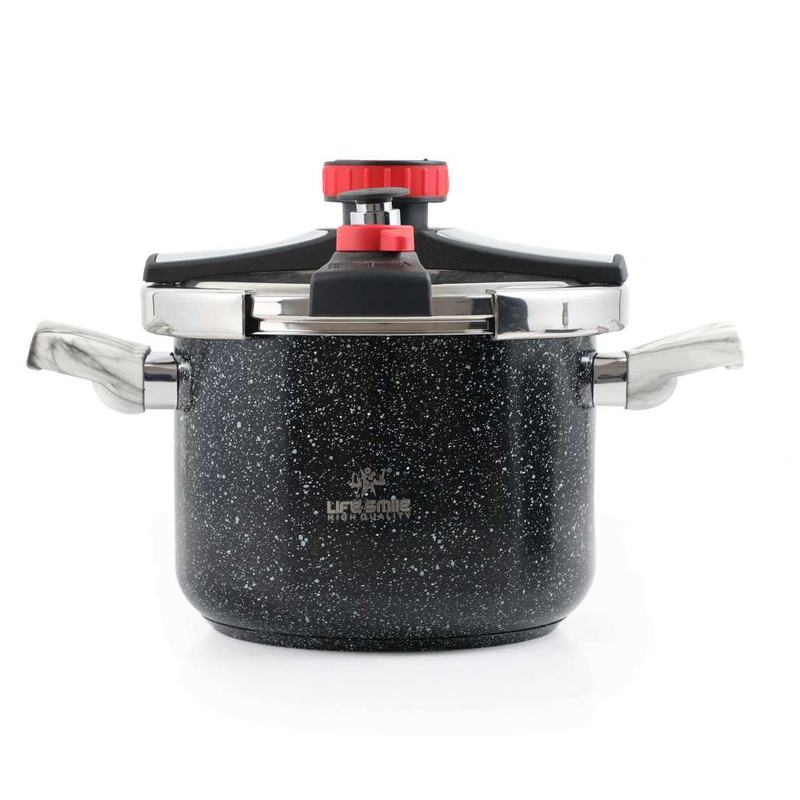سایر توضیحاتزودپز دو قلو لایف اسمایل مدل ZDS-7+5M یکی دیگر از محصولات با کیفیت و کاربردی برند معتبر LIFE SMILE است. این ست از یک دیگ بزرگ به گنجایش 7 لیتر و یک دیگ کوچک به گنجایش 5 لیتر تشکیل شده است. شما با توجه به نیاز خود می‌توانید از هر کدام از دیگ‌ها به عنوان زودپز استفاده کنید و با توجه به درب شیشه‌ای که به همراه ست وجود دارد، دیگ‌ها قابلیت استفاده به عنوان قابلمه هم دارند. جنس بدنه دیگ‌ها از استیل ضد زنگ 18/10 کروم و نیکل است که بسیار مقاوم بوده و رسانای خوبی برای گرما هستند. پوشش بیرونی زودپز گرانیتی است که در مقابل هر گونه خط و خش مقاوم بوده و همچنین شستشوی دیگ‌ها را راحت خواهد کرد. با زودپز دوقلوی مدل LIFE SMILE ZDS 7 5M می‌توانید در کمتر از یک سوم زمان معمول به سرعت غذاهای خانگی را تهیه کرد. کف القایی دیگ‌ها دارای یک لایه ضخیم است که به ماندگاری بیشتر آن‌ها بر روی اجاق گاز کمک می‌کند. این محصول دارای دستگیره‌های سیلیکونی ایمن بوده که در برابر حرارت مقاوم هستند. بر روی درب زودپز یک دریچه به منظور خروج بخار اضافی تعبیه شده است که خیال کاربر را در زمان آشپزی راحت می‌کند. به همراه زودپز لایف اسمایل مدل ZDS-7+5M یک واشر سیلیکونی و یک عدد سبد بخارپز وجود دارد