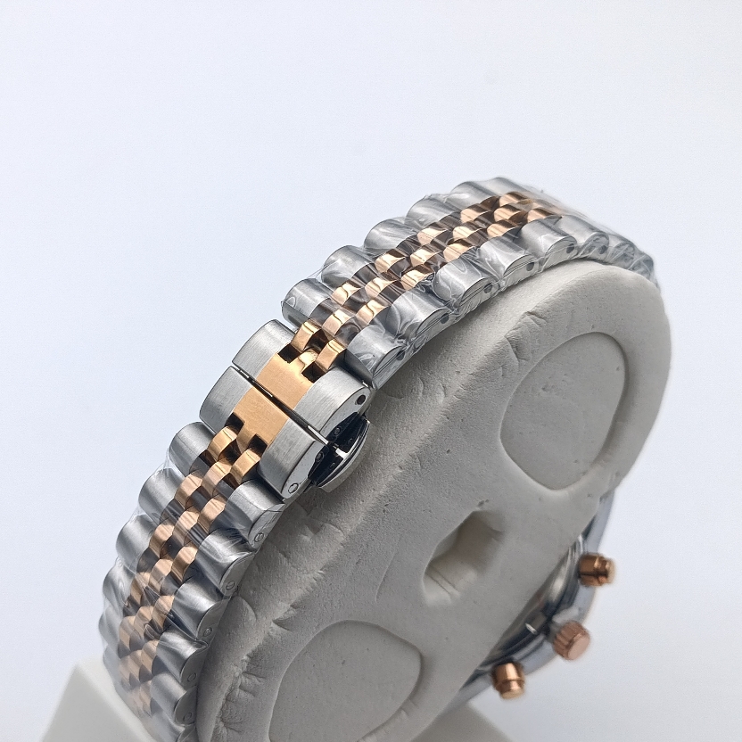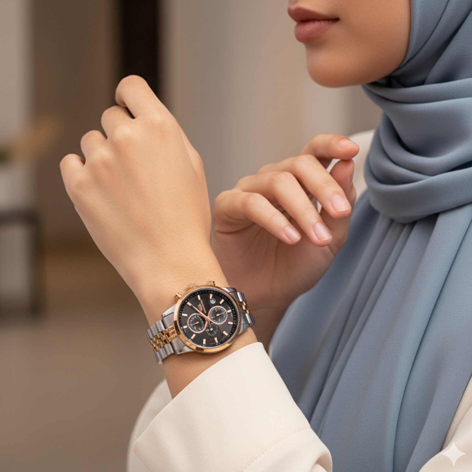 صفحه مشکی این ساعت، پسزمینهای عالی برای نمایش جزئیات است. اندکسهای رزگلد با ظرافت تمام جایگزین اعداد شدهاند و عقربههایی که با همان رنگ پوشش داده شدهاند، خوانایی بینظیری را حتی در یک نگاه کوتاه فراهم میکنند. طرح سه موتور (Chronograph-Style) که بر روی صفحه نقش بسته، ظاهری اسپرت و حرفهای به ساعت بخشیده و حس پیچیدگی فنی ساعتهای ردهبالا را القا میکند. همچنین، نمایشگر تاریخ (تقویم) در این صفحه، یک ویژگی کاربردی و ضروری برای مردان امروزی است.