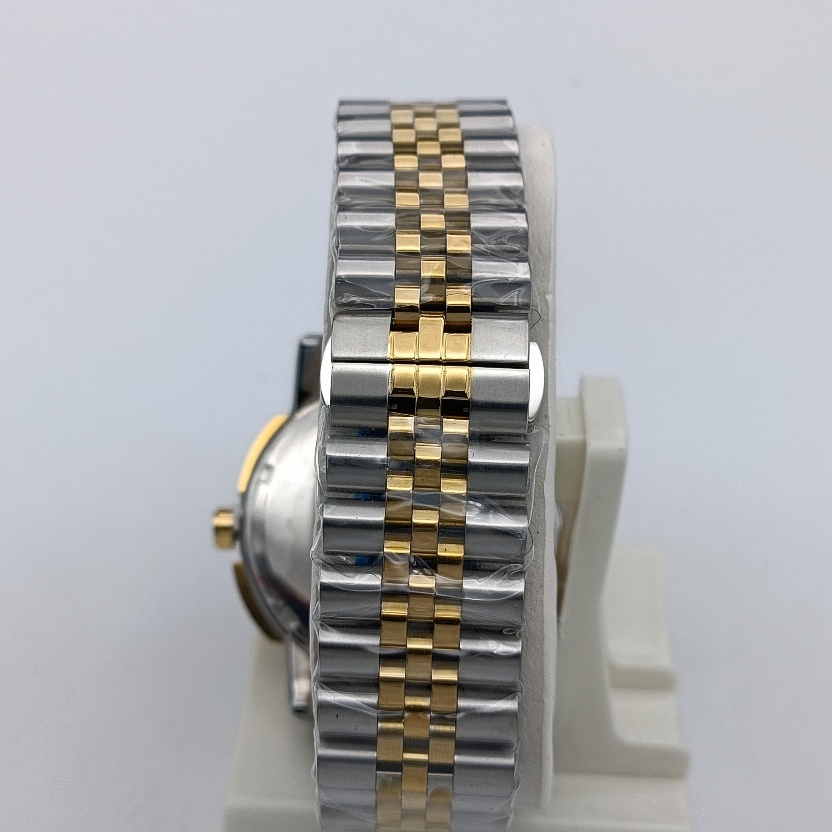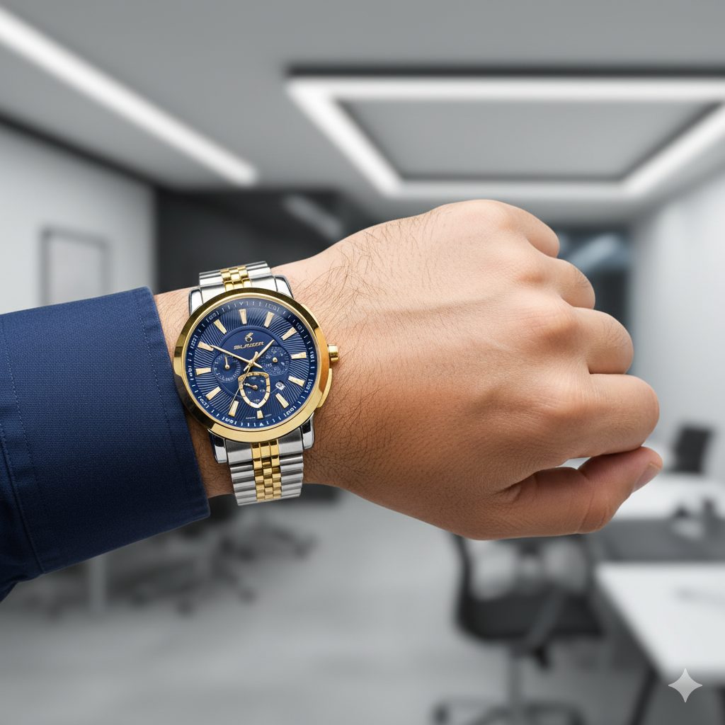 هارمونی چشمنواز قاب و بند دورنگ (طلایی و استیل) در کنار صفحه سرمهای رمزآلود، اولین چیزی است که توجه را به خود جلب میکند. رنگ طلایی، نمادی از موفقیت و اعتبار است، در حالی که رنگ سرمهای، وقار و عمق شخصیت شما را بازتاب میدهد. طراحان ساعت بلیزر با این ترکیب، ساعتی خلق کردهاند که هم برای جلسات رسمی کاری و هم برای رویدادهای خاص، یک همراه بینقص محسوب میشود. در نتیجه، این فقط یک ساعت نیست، بلکه بخشی از استایل منحصر به فرد شماست.