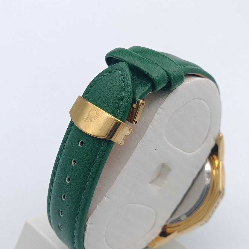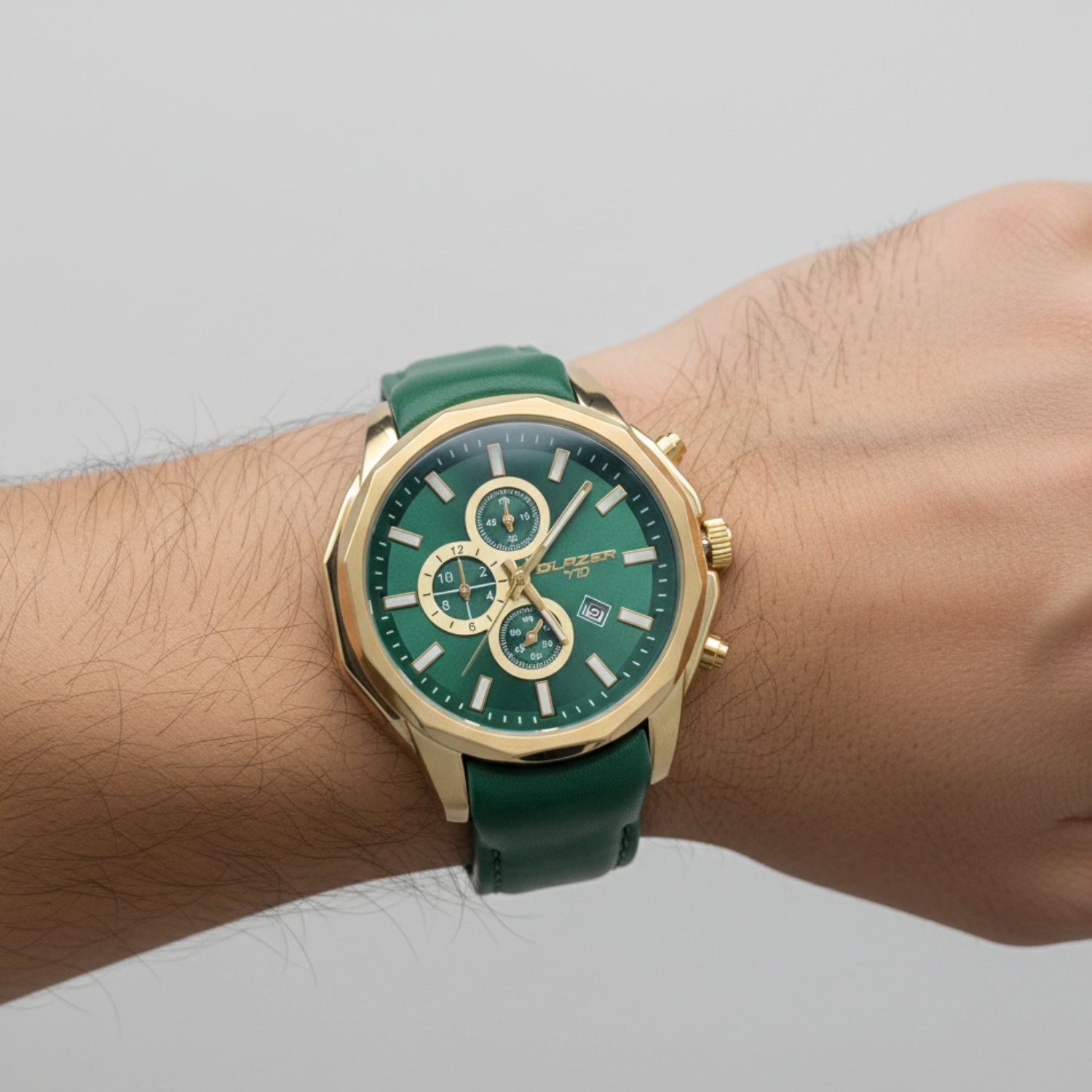 ساعت بلیزر طلایی صفحه سبز چرمی: بیانیهای از شکوه بر مچ دستان شما