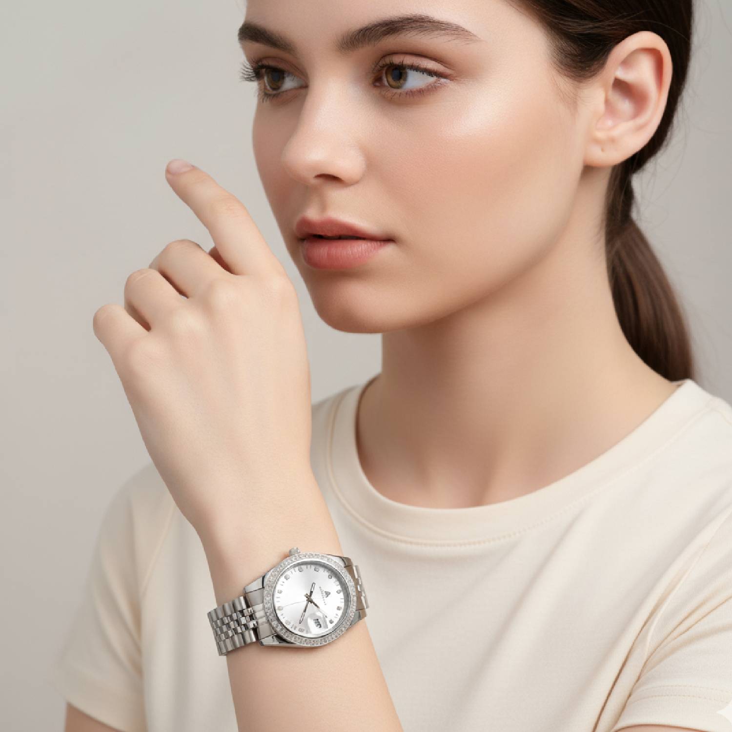 آنچه ساعت دور نگین استیل صفحه سفید الکس مارتین زنانه را از سایر مدلها متمایز میکند، نگینهای درخشان کار شده در اطراف قاب است. این نگینها نور را به زیبایی منعکس کرده و به مچ دست شما جلوهای مجلل و خیرهکننده میبخشند. در نتیجه، این ساعت برای مجالس رسمی، مهمانیها و همچنین استفاده روزمره جهت افزودن یک عنصر لوکس به استایل شما ایدهآل است. علاوه بر این، صفحه سفید رنگ آن، کنتراستی عالی با نگینها و بند استیل ایجاد میکند که خوانایی ساعت را نیز بالا میبرد.
