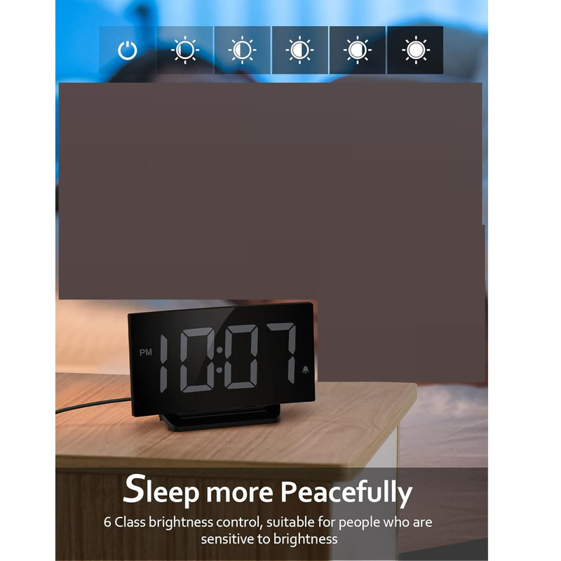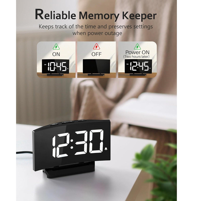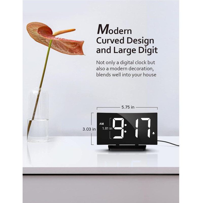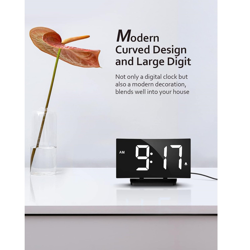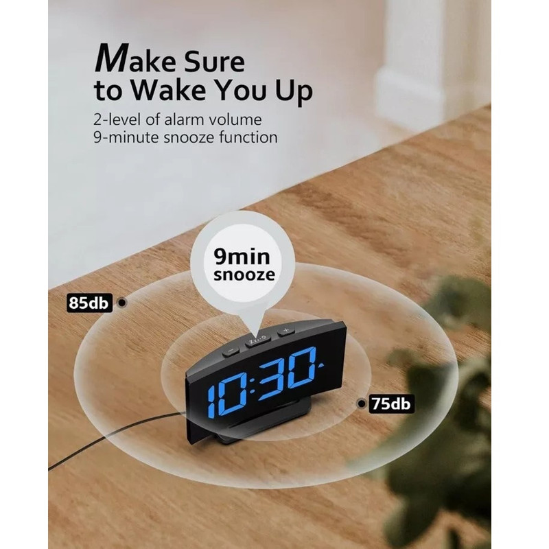 سایر توضیحاتصفحه نمایش LED بزرگ و شفاف با 5 DIMMER + خاموش - اگر از عینک استفاده می کنید، ممکن است یک ساعت دیجیتال با نمایشگر بزرگ بخواهید. اگر به نور حساس هستید، ممکن است به دنبال یک ساعت کنار تخت با طیف وسیعی از گزینه های کم نور باشید. این ساعت زنگ دار منحصر به فرد همه چیز را دارد و تمام انتظارات شما را برای نمایش برآورده می کند. ما به بازخورد شما گوش دادیم و حداکثر روشنایی را در نسخه جدید بهبود دادیم. 5 سطح روشنایی + خاموش به شما امکان می دهد صفحه نمایش را از روشن به نامرئی تنظیم کنید. 3 زنگ هشدار و 2 صدای زنگ هشدار - افراد مختلف نیازهای متفاوتی در مورد صدای زنگ هشدار و میزان صدا دارند، بنابراین کنترل صدا و صدا واقعا مهم است. ساعت زنگ دار دیجیتال ما برای اتاق خواب دارای 2 سطح تنظیم صدای زنگ است که می تواند از 75-85 دسی بل تنظیم شود. نیازی نیست نگران باشید که صدای زنگ خیلی بلند است و شما را می ترساند یا خیلی کم است که شما را از خواب عمیق بیدار نمی کند. 3 صدای زنگ ثابت موسیقی (آواز پرندگان، بیپ و آکورد) وجود دارد که می توانید یکی از آنها را انتخاب کنید. 9 دقیقه زمان تعویق -- آیا از برخاستن از رختخواب خود ناراحت هستید؟ دکمه چرت زدن در بالای ساعت کنار تخت دارای یک خط افقی برجسته برای موقعیت یابی سریع است که کارکرد آن آسان و ساده بدون باز کردن چشمان شما در هنگام خواب آلودگی است. برای یک ساعت زنگ دار اولیه برای استفاده خانگی، این کافی است. لطفاً توجه داشته باشید: xxزمانی که برای اولین بار آن را روشن می کنید به طور پیش فرض زنگ ساعت 6 وجود دارد، اگر به آن نیاز ندارید، لطفاً به کلید بی صدا بروید xx عملکرد حافظه و حالت 12/24- برای این ساعت زنگ دار برای اتاق خواب، شما می توانید بین زمان استاندارد یا زمان نظامی انتخاب کنید تا عادت های زمان مطالعه خود را برآورده کنید. ویژگی باتری برای به خاطر سپردن تنظیمات در صورت قطع برق اصلی کار می کند. در حین پشتیبان‌گیری باتری، صفحه نمایش خالی می‌شود و زنگ هشدار به صدا در نمی‌آید، اما ساعت زمان صحیح را پس از بازیابی برق نمایش می‌دهد. لطفا توجه داشته باشید که این ساعت فقط با اتصال به پورت USB تغذیه می شود. طراحی منحصر به فرد منحنی آن را به یک هدیه خوب تبدیل می کند - این ساعت زنگ دار می تواند با دکوراسیون داخلی شما ترکیب شود. منحنی ظریف صفحه ساعت که با تطبیق پذیری در ذهن طراحی شده است، همراه با اعداد LED آبی چشم نواز، می تواند ظاهری چشمگیر ایجاد کند که ریتم زمان را به تصویر می کشد. ساعت شیک کنار تخت می تواند یک انتخاب عالی به عنوان هدیه برای هر کسی باشد.