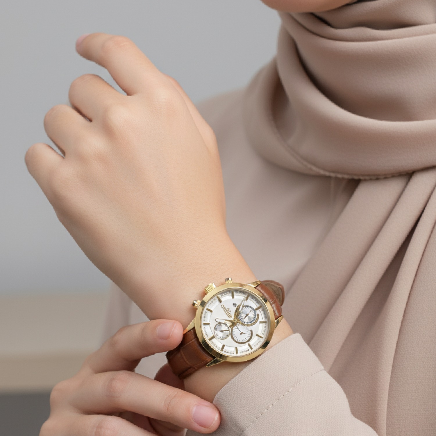صفحه سفید کلاسیک: صفحه نمایش سفید و خوانای این مدل، با اندکسهای طلایی و عقربههایی که با ظرافت تمام طراحی شدهاند، کنتراست بینظیری ایجاد کرده است. علاوه بر این، طراحی الهامگرفته از کرنوگرافهای کلاسیک (طرح سه موتوره)، حسی از پویایی و عملکرد حرفهای را القا میکند.