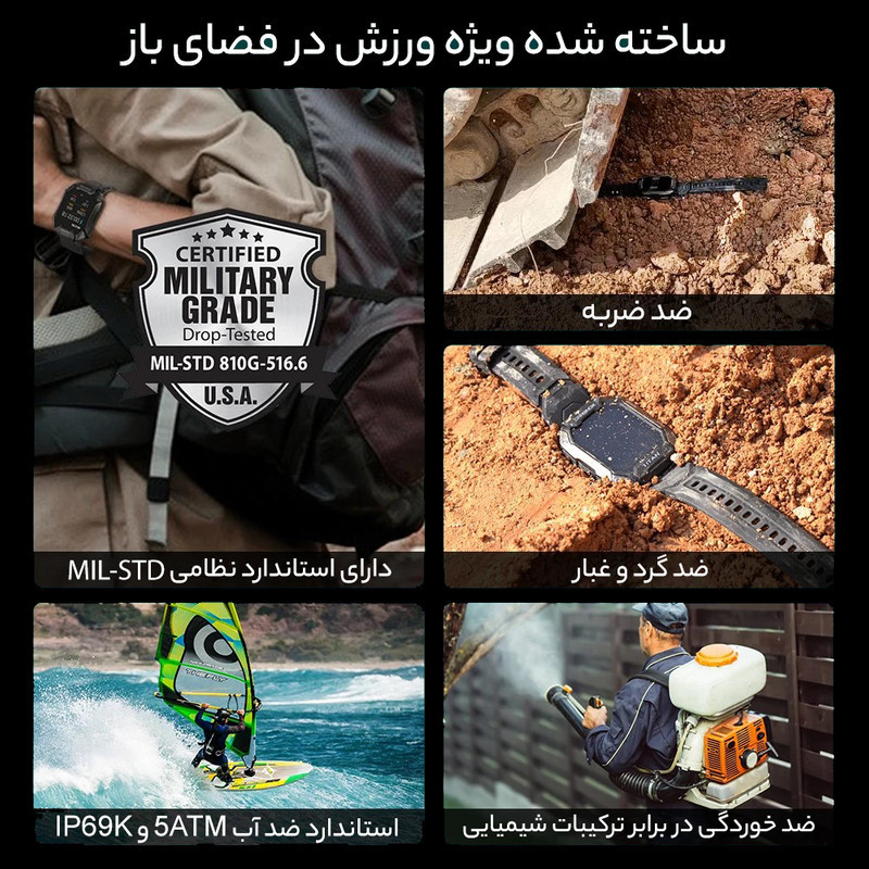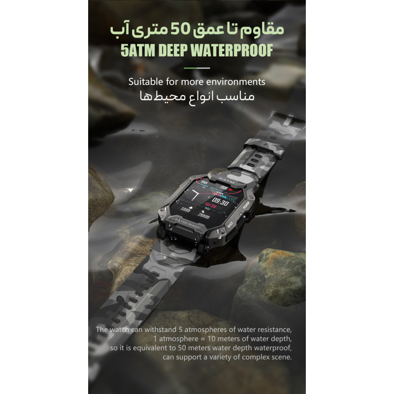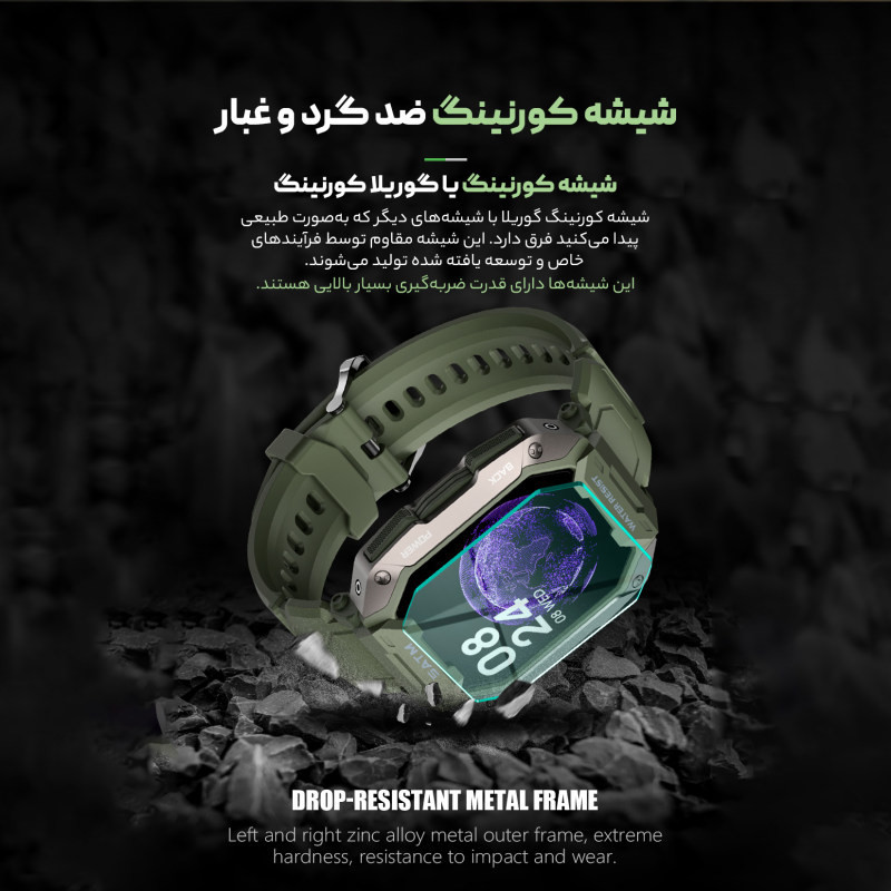 ساعت هوشمند C20 محصولی ضد آب و مقاوم تا عمق 50 متری آب است که از نمایشگر تمام لمسی 1.71 اینچی لمسی خازنی G+F، Hynitron 816D با وضوح 280x320 پیکسل بهره میبرد. این ساعت در برابر نفوذ خاک، گرد و غبار، مایعات و ترکیبات شیمیایی، ضربات سخت و... کاملا مقاوم است. شیشه صفحه این ساعت کورنینگ گوریلا گلس3 میباشد که توسط فرآیندهای خاص و توسعه یافته مقاوم سازی شده است. این شیشهها دارای قدرت ضربهگیری بسیار ب...