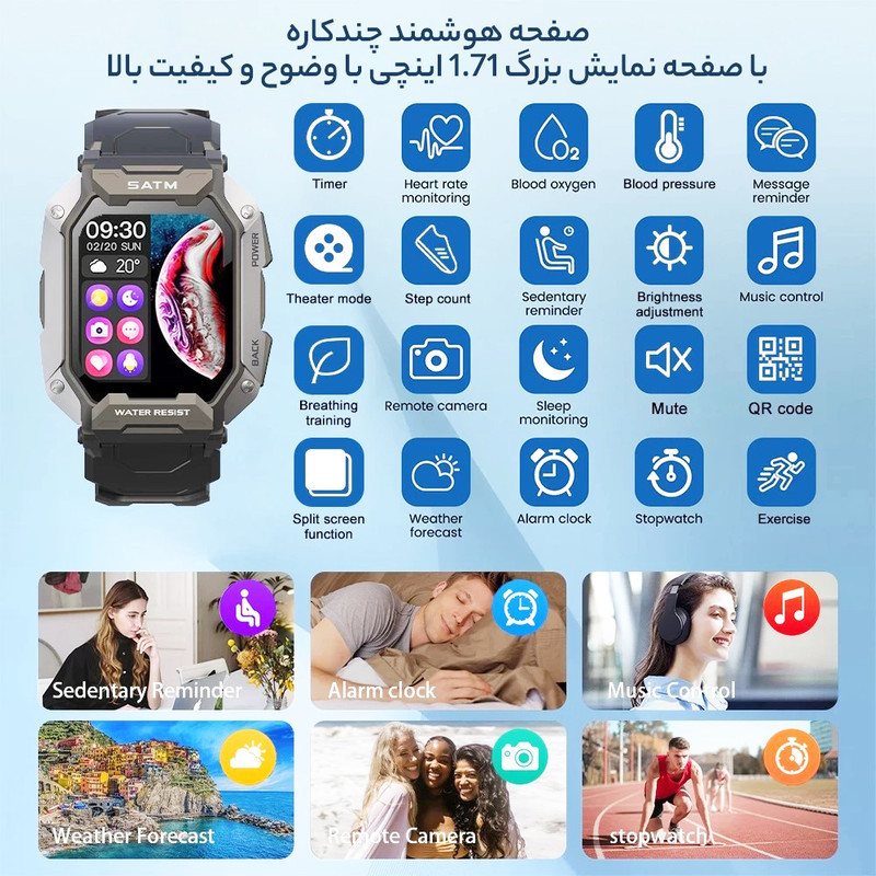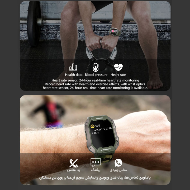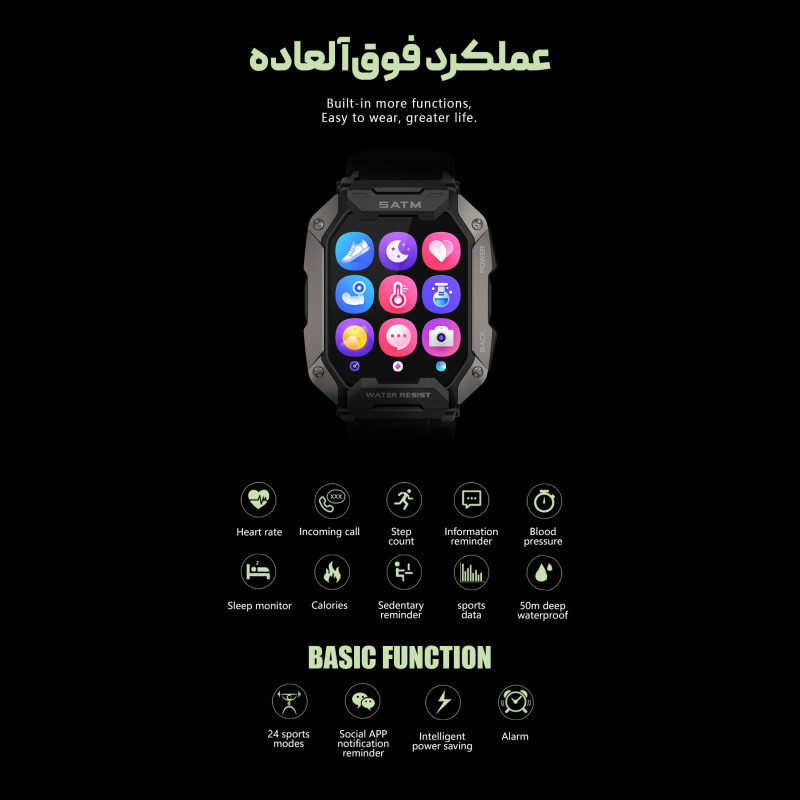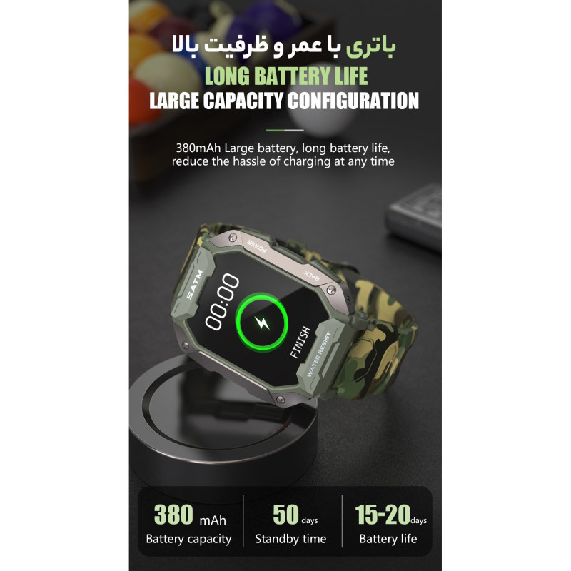 ساعت هوشمند C20 محصولی ضد آب و مقاوم تا عمق 50 متری آب است که از نمایشگر تمام لمسی 1.71 اینچی لمسی خازنی G+F، Hynitron 816D با وضوح 280x320 پیکسل بهره میبرد. این ساعت در برابر نفوذ خاک، گرد و غبار، مایعات و ترکیبات شیمیایی، ضربات سخت و... کاملا مقاوم است. شیشه صفحه این ساعت کورنینگ گوریلا گلس3 میباشد که توسط فرآیندهای خاص و توسعه یافته مقاوم سازی شده است. این شیشهها دارای قدرت ضربهگیری بسیار بالایی هستند. این محصول از باتری 380 میلی آمپر ساعتی از نوع مقاوم و محبوب کبالت پلیمیری (Polymer cobalt) بهره میبرد، به همین دلیل ظرفیت نگهداری شارژ بالایی را خواهد داشت. این ساعت با فضای باز و ورزش بسیار سازگار است و بیش از 24 حالت ورزشی مختلف را پشتیبانی میکند. ساعت هوشمند C20 همچنین یک همراه متخصص و همیشگی در مانیتورینگ، پایش و تجزیه و تحلیل سلامت شماست و اطلاعاتی نظیر ضربان قلب، اکسیژن و فشار خون، کنترل کیفیت خواب و... را در اختیار شما قرار میدهد.