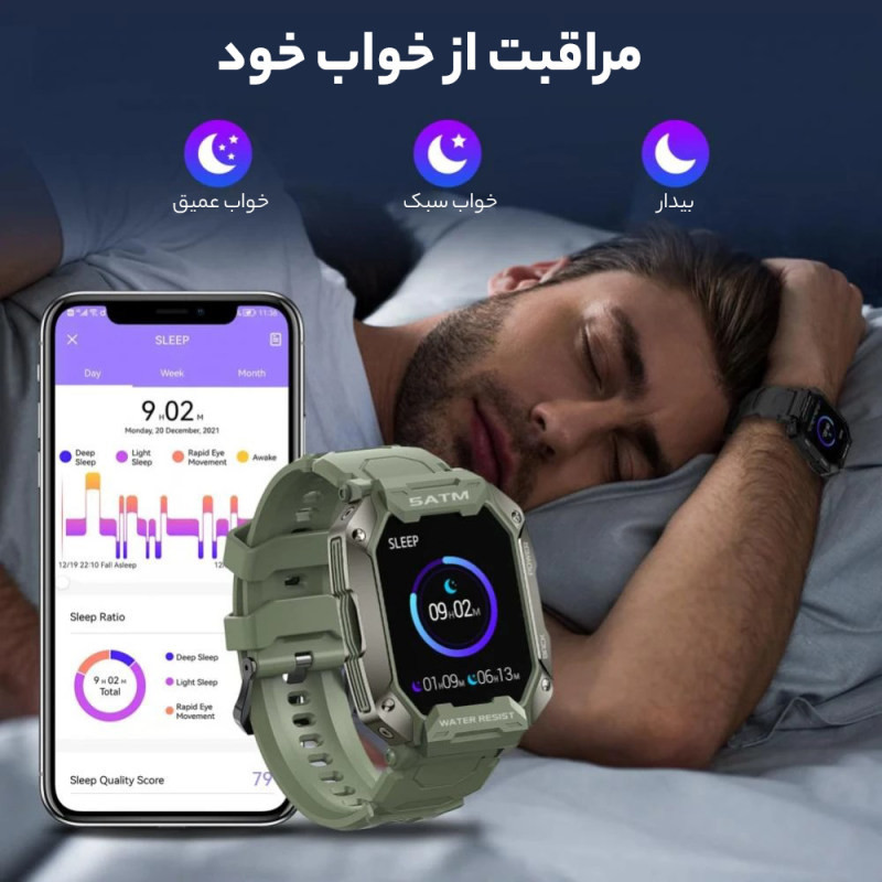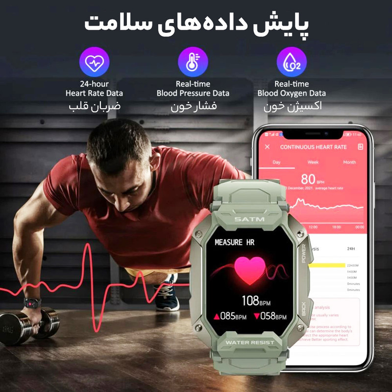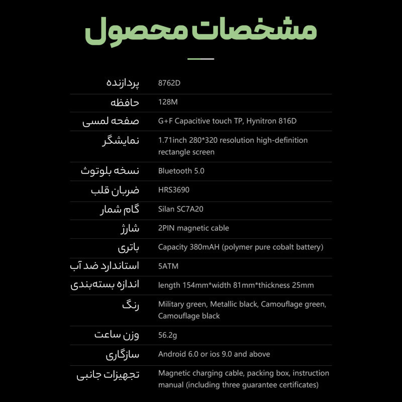 | قابلیتهای ساعت هوشمند | صفحه نمایش رنگی , صفحه نمایش لمسی , کنترل موسیقی (Music Player) , کنترل سطح اکسیژن خون |