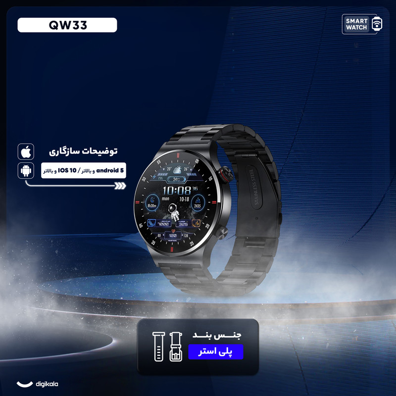 ساعت هوشمند QW33 با طراحی کلاسیک و بدنهی استیل، گزینهای شیک و کاربردی برای آقایان و بانوان است. صفحه نمایش ۱.۲۸ اینچی، اطلاعات را به خوبی نمایش میدهد. قابلیت مکالمه بلوتوثی، کنترل موسیقی و دریافت اعلانها، ارتباط آسان با گوشی را فراهم میکند. حسگرهای اکسیژن خون، فشار خون، پایش قلب و گامشمار، به حفظ سلامتی و تناسب اندام کمک میکنند. بند استیل با قفل ضامندار و بند سیلیکونی اضافی، تنوع و راحتی را ارائه میدهد. باتری ۲۶۰ میلیآمپر ساعتی و اقلام همراه مانند بند سیلیکونی اضافی، ارزش خرید این ساعت را بالا میبرند. QW33 برای کسانی که ساعتی با ظاهر کلاسیک و امکانات هوشمند میخواهند، انتخابی ایدهآل است و با توجه به قیمت مناسب، ارزش خرید بالایی دارد. این ساعت با ارائه امکانات ضروری در قالبی زیبا، میتواند همراه مناسبی در فعالیتهای روزمره و ورزشی باشد.