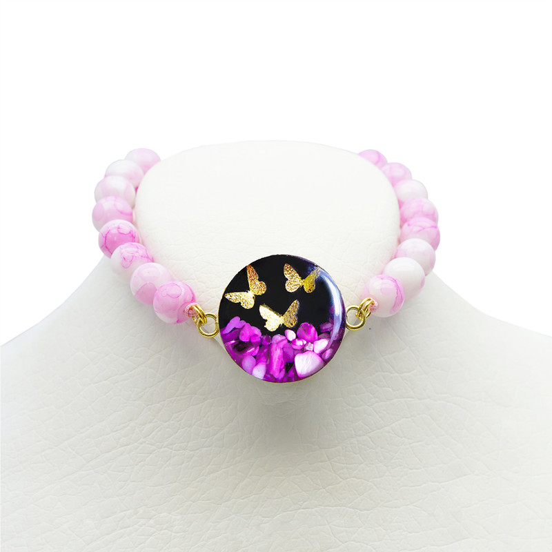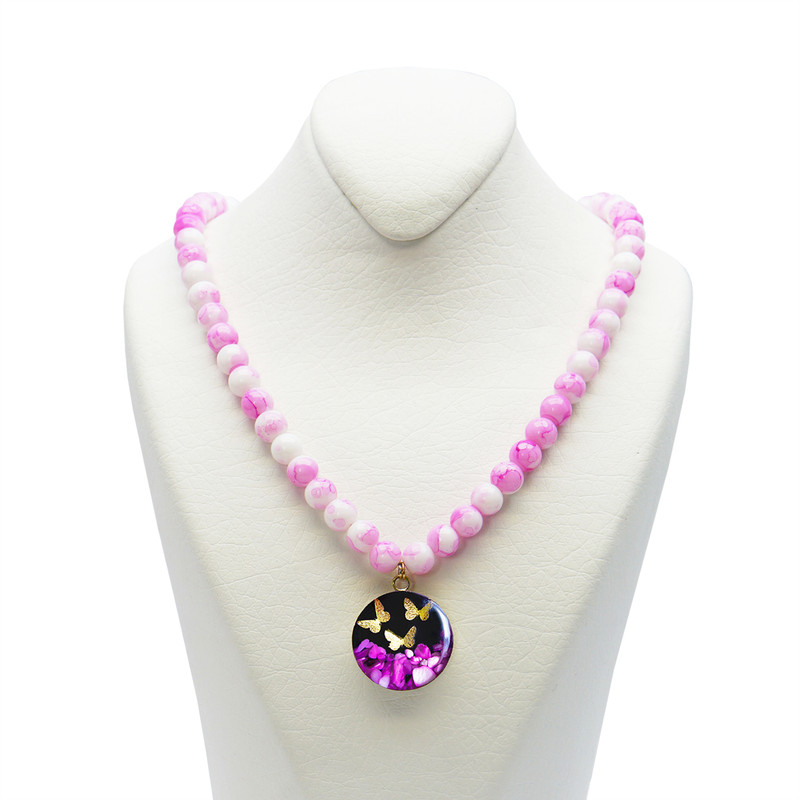 پلاک سنگی گردنبد، دستبند، انگشتر و گوشواره این مجموعه، ترکیبی است از سه پروانه روکش طلا با سنگ های ریز صورتی رنگ که چنین ترکیبی این محصول را منحصر بفرد کرده است. گردنبند با قفل بسیار ظریف آن به خوبی به هم می چسبند. انگشتر و دستبند این مجموعه نیز می تواند به سایز های مختلف تبدیل شده و به خوبی روی انگشتان ظریف شما بنشیند.