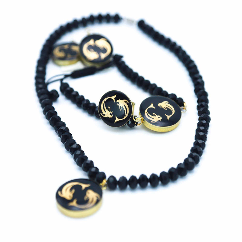 محصولات دستساز آلتین هنر، حس و انرژی بی نظیر هنر ایرانی را در ست کامل اونیکس ماه اسفند خلاصه کرده است. درخشش ورق طلای طرح ماهی در وسط گردنبند شما با ماه سمبل اسفند روی دستبند، گوشواره و انگشتر سنگ زیبای اونیکس، می تواند هر چشمی را خیره کند.