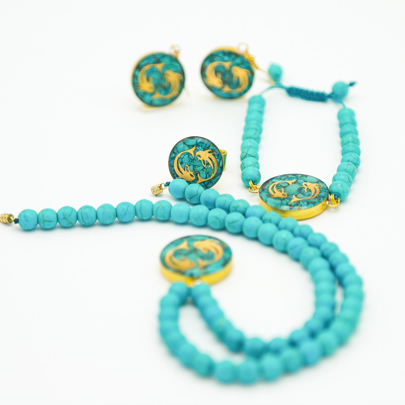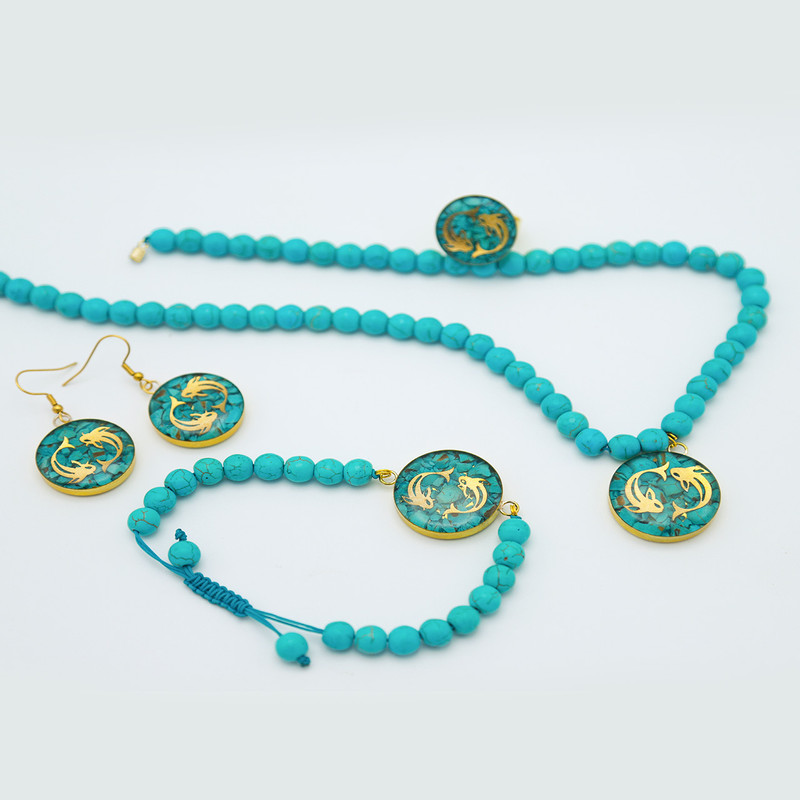 گردنبند، دستبند ، گوشواره و انگشتر این مجموعه که به عنوان ست کامل تعریف شده اند به علت انرژی درمانی سنگ فیروزه مناسب استفاده روزمره است و با هر نوع لباس و رنگ و پارچه ای بر تن شما مینشیند.