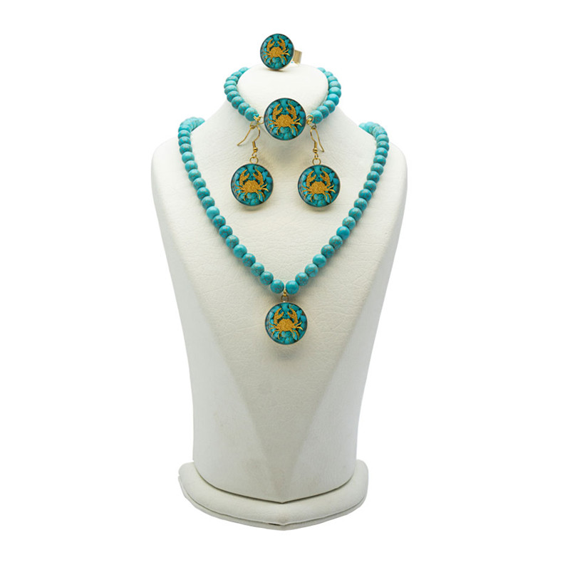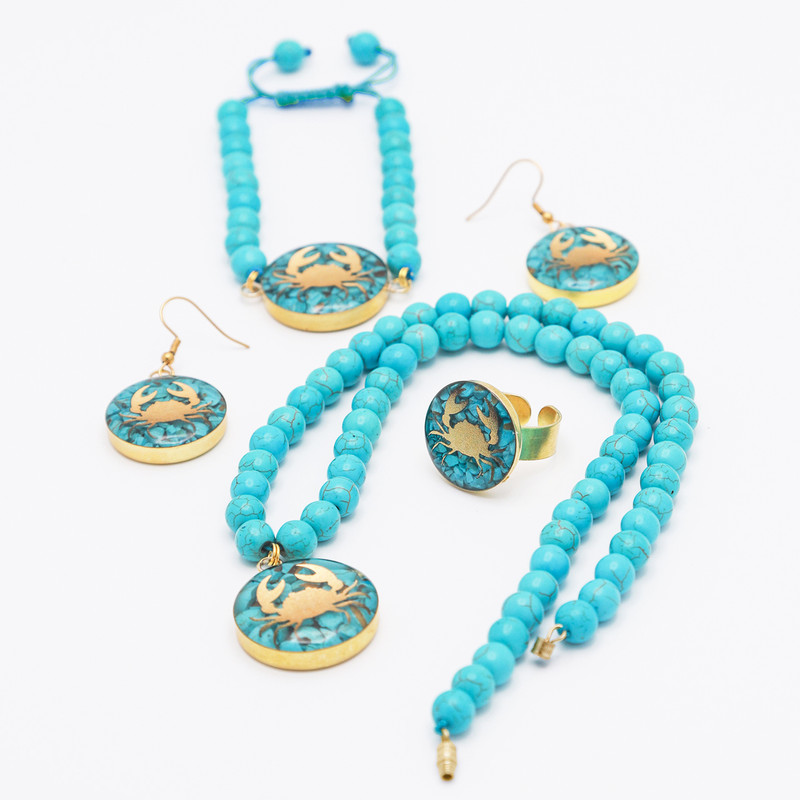 مهره‌های فیروزه‌ای، همچون امواج آرامش‌بخش دریا، یادآور احساسات عمیق و لطافت قلب متولدین تیر هستند. پلاک‌های روکش طلا با نماد ماه تیر (خرچنگ)، با ظرافت و دقت طراحی شده‌اند و جلوه‌ای خاص به این ست بخشیده‌اند.