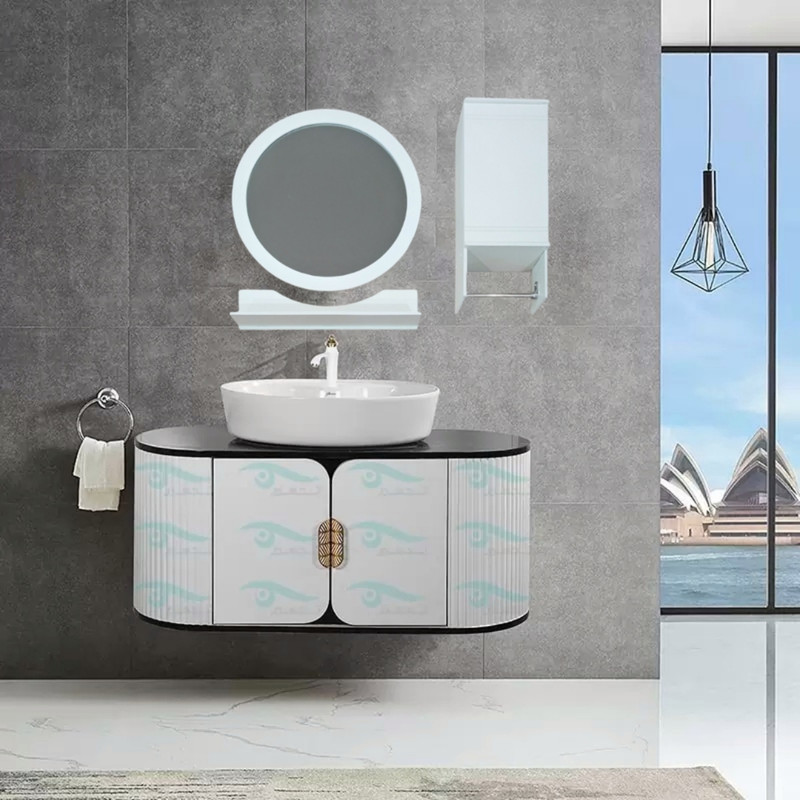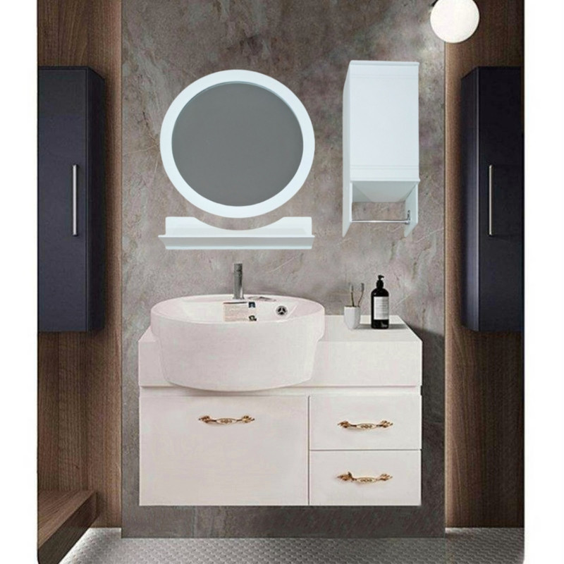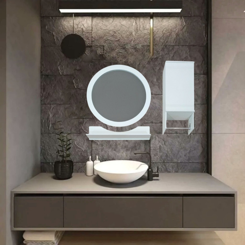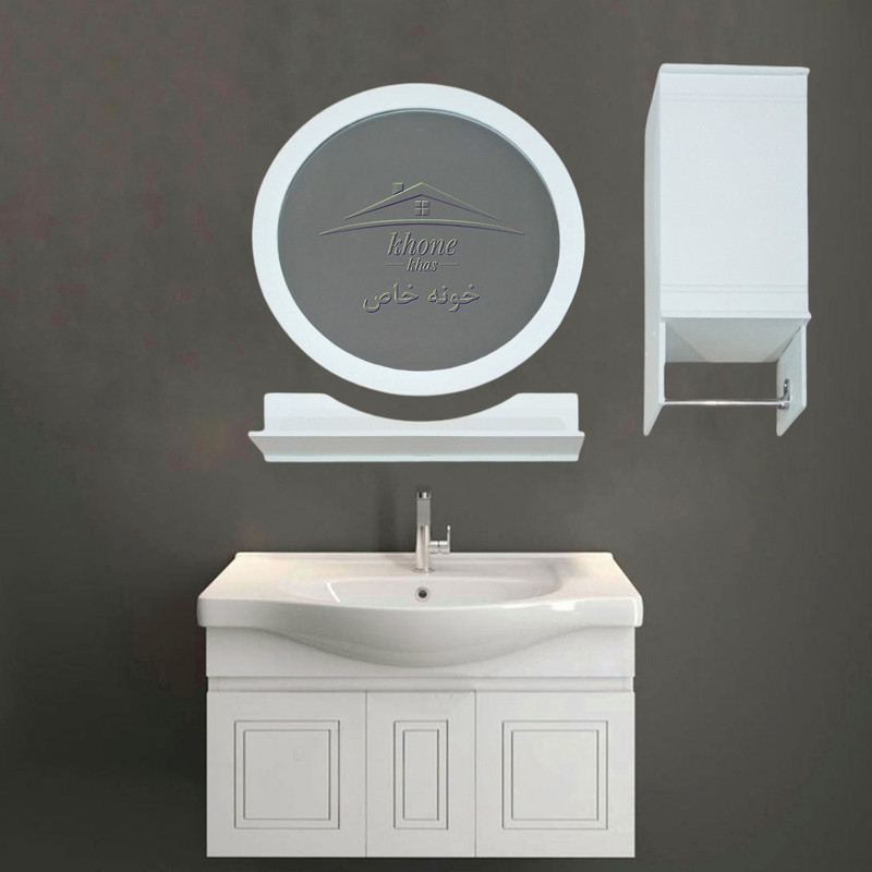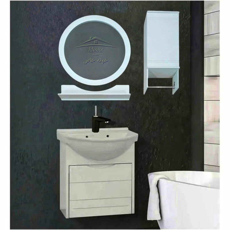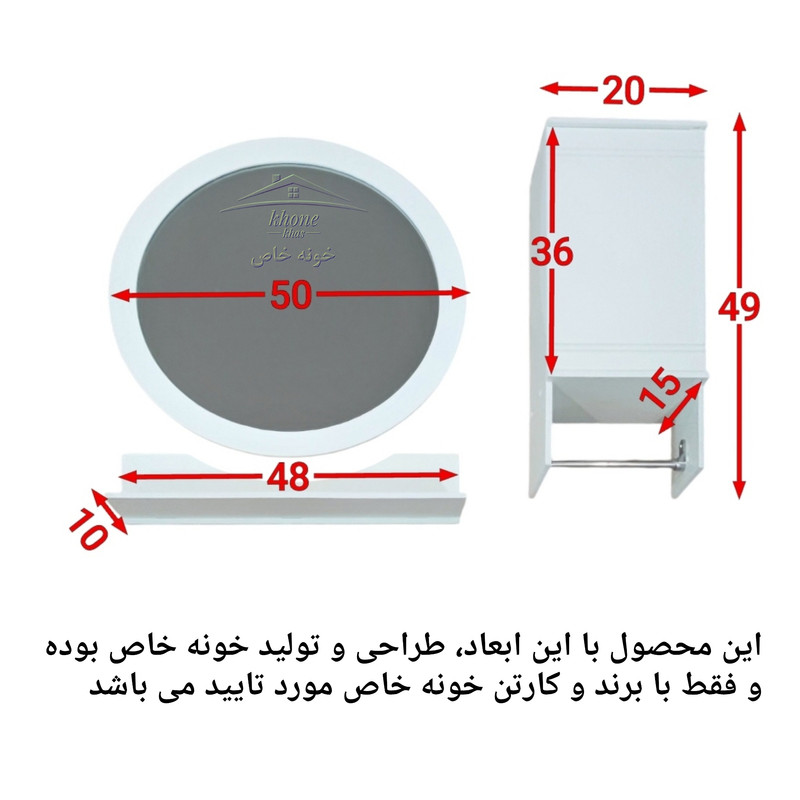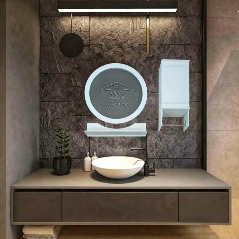 ست 3 تکه آینه گرد و شلف زیر آینه به همراه باکس مدرن با طراحی زیبا و جنس پی وی سی قابل شستشو با قیمتی بسیار مناسب و اقتصادی (بدلیل خرید مستقیم و بدون واسطه از تولید کننده) گزینه ای بسیار شیک و مناسب برای سرویس بهداشتی می باشد. بدنه ی PVC این محصول دارای خاصیت ضد آب و استحکام بسیار بالایی می باشد و از این رو شما می توانید بدون نگرانی از کاهش کیفیت محصول از آن در محیط های مرطوب، سرویس بهداشتی، حمام همچنین در آرایشگاه ها نیز استفاده نمائید. این محصول در ابعاد بزرگ و بسیار کاربردی طراحی و تولید شده است بطوری که ابعاد آن کاربردی بوده و کوچک و فانتزی نیست. این محصول دارای آویز حوله میله ای از جنس استیل ضد زنگ می باشد