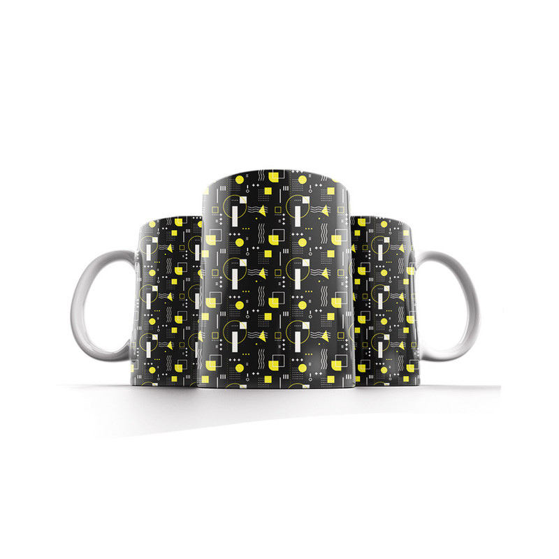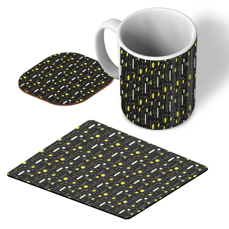 ست ماگ ترمه طراحان ایده مدل پترن دایره و مثلث زرد کد strm0251 همراه با زیر لیوانی و موس پد