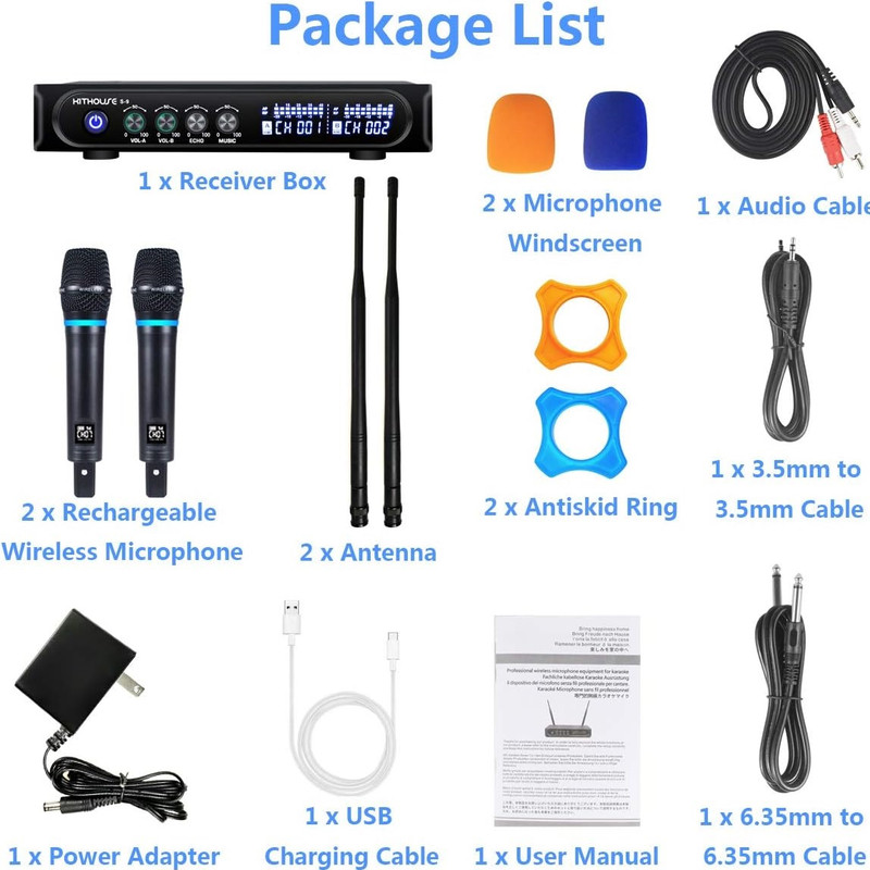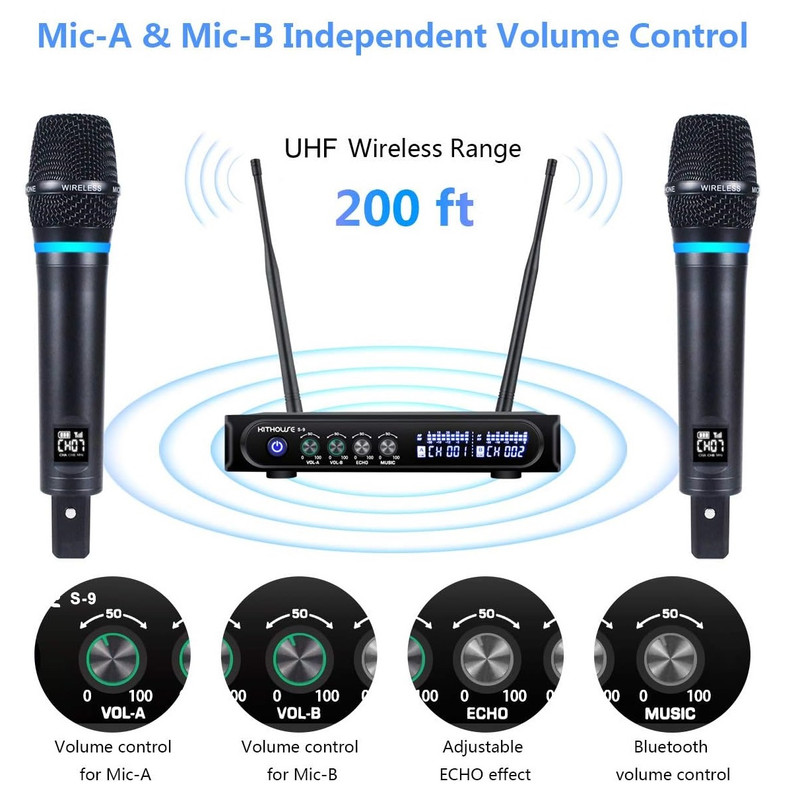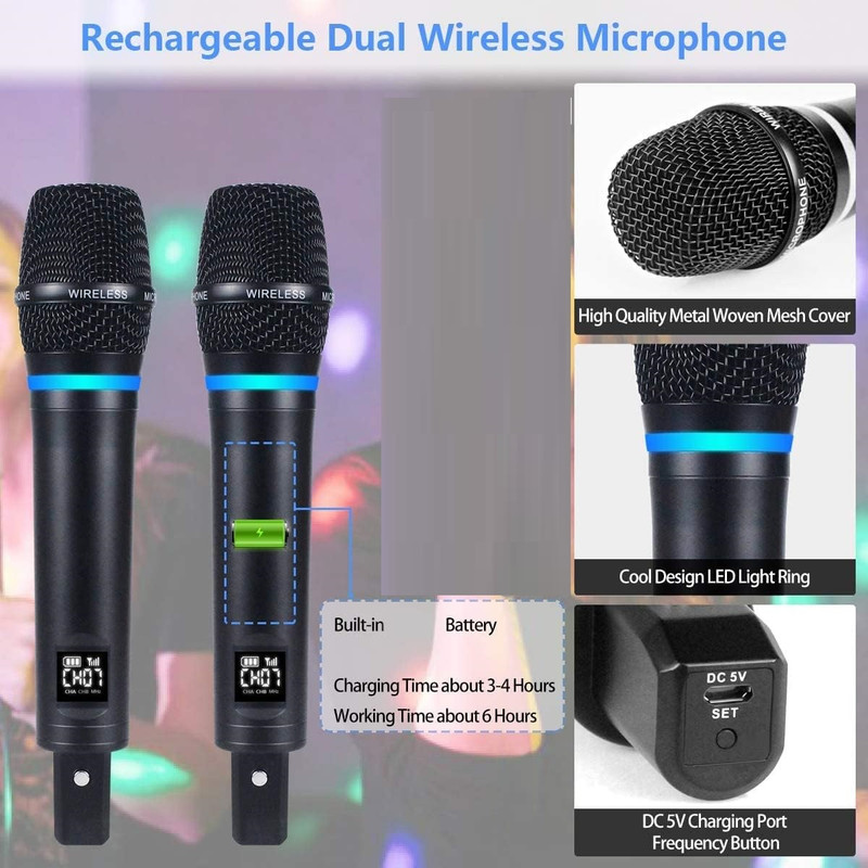 سیستم میکروفون بی‌سیم قابل شارژ که با این قیمت در بازار موجود است - میکروفون بی‌سیم قابل شارژ دوگانه UHF با سیستم گیرنده بلوتوث. مناسب برای کارائوکه، سخنرانی، جلسه، مهمانی، کلیسا، عروسی، دی‌جی، اجرا، داخل یا خارج از منزل. نیازی به تنظیم نیست! فقط وصل کنید و استفاده کنید! برد بی‌سیم حداکثر تا ۲۰۰ فوت، برای استفاده عادی کافی است؛ جعبه گیرنده با کنترل صدای مستقل Mic-A و Mic-B؛ جلوه ECHO قابل تنظیم؛...