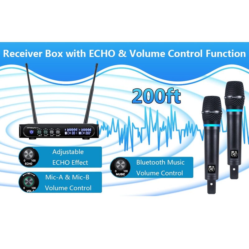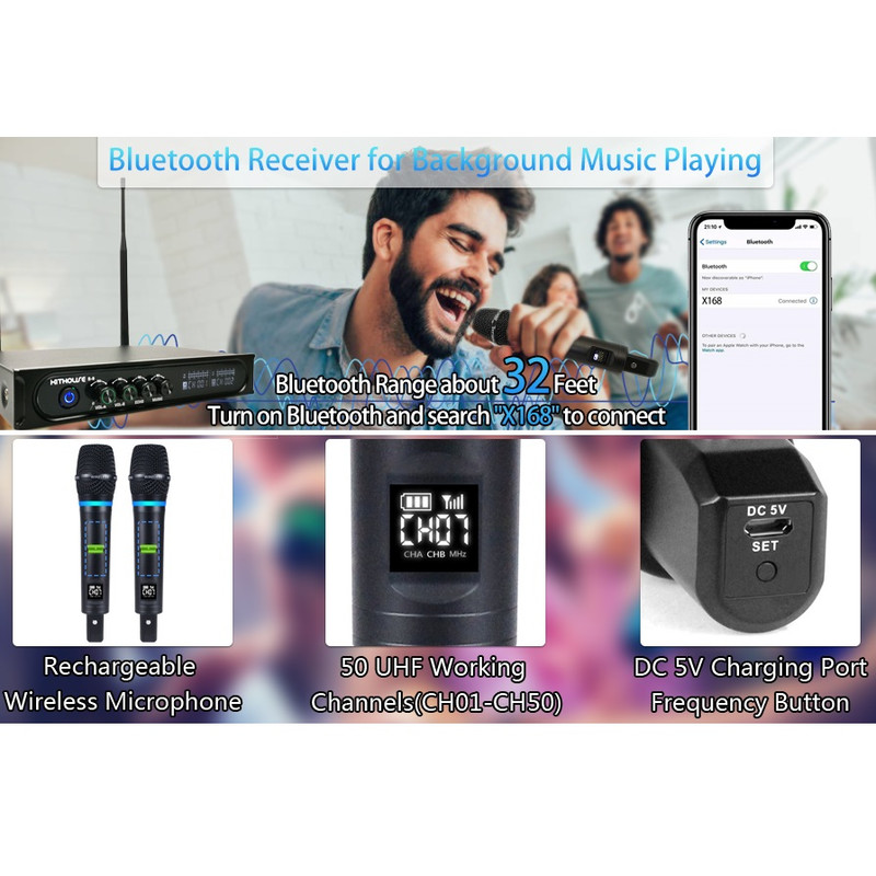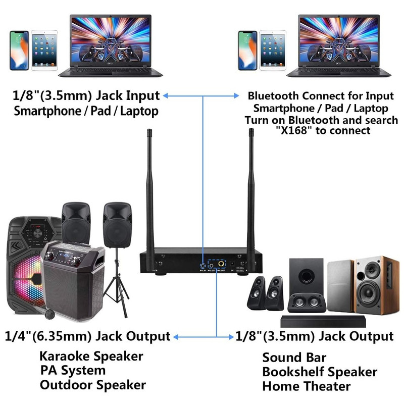 برد بی‌سیم حداکثر تا ۲۰۰ فوت، برای استفاده عادی کافی است؛ جعبه گیرنده با کنترل صدای مستقل Mic-A و Mic-B؛ جلوه ECHO قابل تنظیم؛ عملکرد بلوتوث برای پخش موسیقی پس زمینه (بلوتوث را روشن کنید و "X168" را برای اتصال جستجو کنید، برد BT حدود ۳۲ فوت)؛ طراحی برای بلندگوی کارائوکه، سیستم PA، بلندگوی فضای باز، ساندبار، بلندگوی قفسه‌ای، سینمای خانگی و غیره (توجه: این سیستم را نمی‌توان برای بلندگوهای بلوتوث استفاده کرد، زیرا بلندگوهای بلوتوث جک میکروفون ندارند)