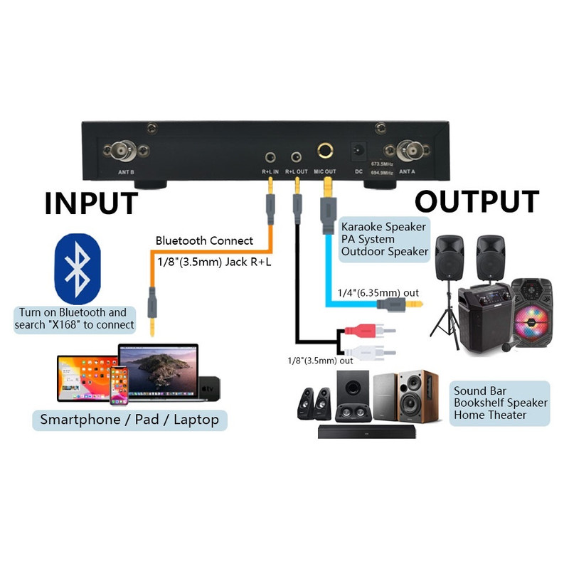 دو راه برای ورودی: ورودی سیمی (ورودی جک 1/8 اینچی (3.5 میلی‌متری)) یا ورودی اتصال بلوتوث (بلوتوث را روشن کنید و برای اتصال "X168" را جستجو کنید)؛ دو راه برای خروجی: خروجی جک 1/4 اینچی (6.35 میلی‌متری) یا 1/8 اینچی (3.5 میلی‌متری)
