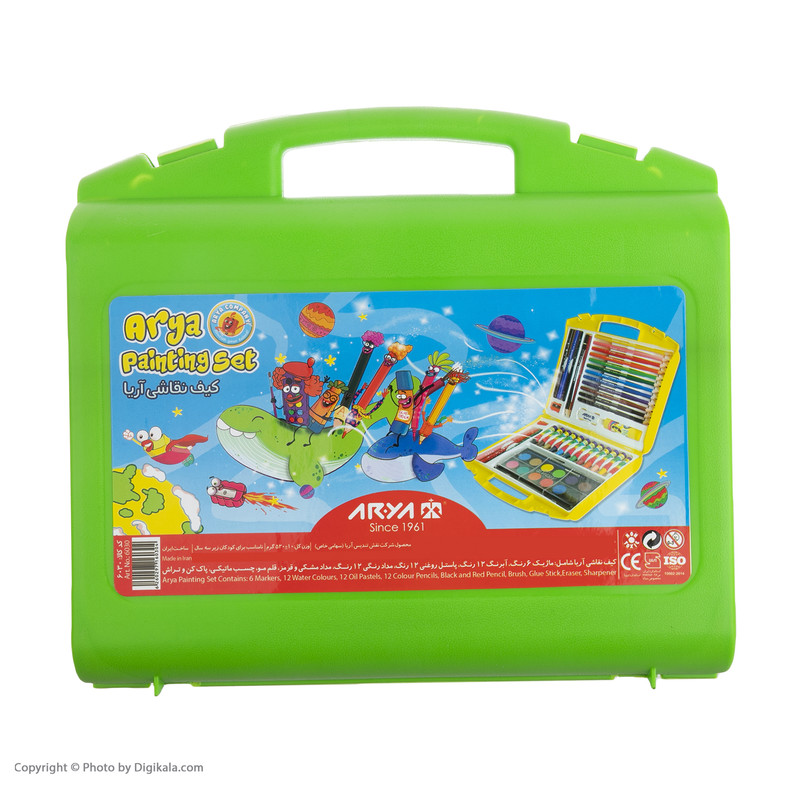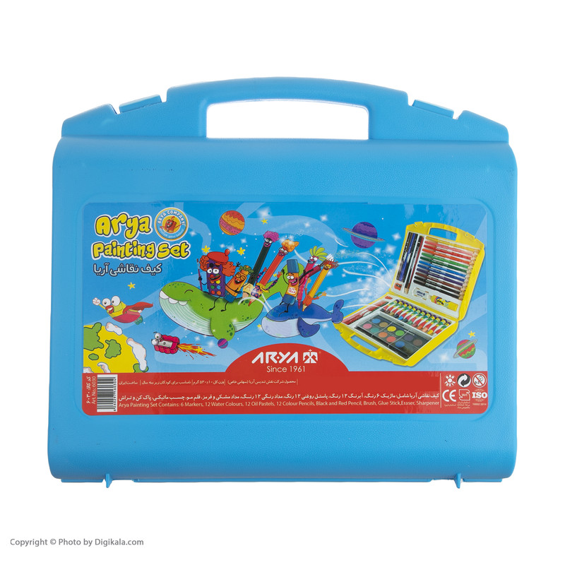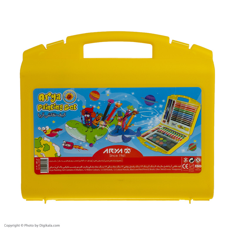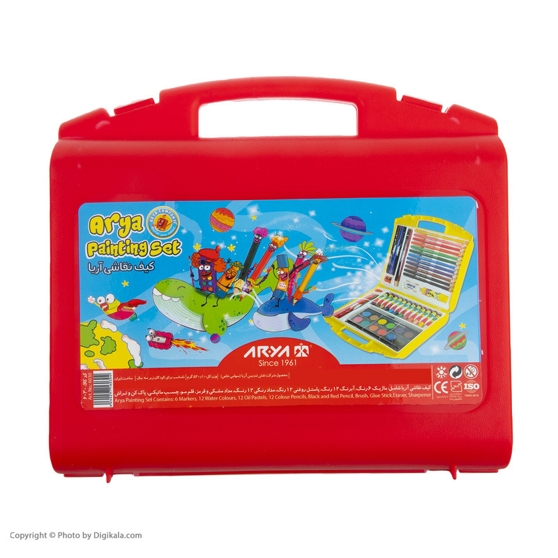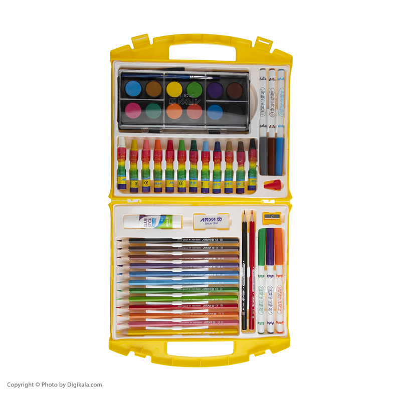 سایر توضیحات- 12 عدد مداد رنگی - 12 عدد پاستل - 12 عددابرنگ - 6 عدد ماژیک - یک عدد مداد مشکی - یک عدد مداد قرمز - دو عدد مداد تراش - یک عدد پاک کن - یک عدد قلم مو گواش - یک عدد چسب ماتیکی