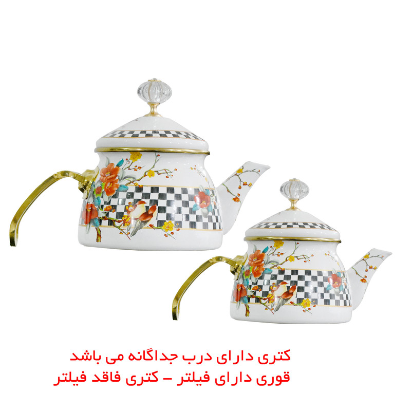 | سایر توضیحات | محصول کشور ترکیه - خوردن چای در اکثر خانه ها جزو تکرار های روزانه آن محسوب می شود. درست کردن چا با انواع چای ساز ها و چای های کیسه ای ممکن است آن طمع مد نظر را به شما ندهد بنابراین وجود قوری و کتری هم هنوز در بسیاری از خانه ها جایگاه ویژه ای دارد - چایی که بر روی شعله دم می شود عطر و طعم بسیار دلنشین تری نسبت چای کیسه ای خواهد داشت - اگر تمایل دارید تا طعم واقعی چای را بچشید بهترین کار تهیه ی کتری می باشد - این ست کتری و قوری یک ست بسیار جذاب می باشد چراکه با انواع طرح هایی که دارد به آشپزخانه ی شما جلوه ای دیگر می دهد - کتری دارای درب جداگانه می باشد - قوری دارای فیلتر و کتری فاقد فیلتر می باشد - طراحی زیبا - قابلیت قرارگیری قوری برروی کتری بدون آن که تعادل آن برهم خورد |