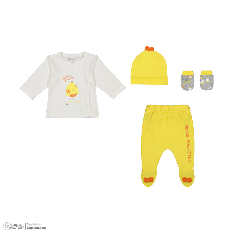| جزئیات | این ست شامل بلوز آستین بلند، شلوار جوراب دار، کلاه و دستکش نوزادی است. |