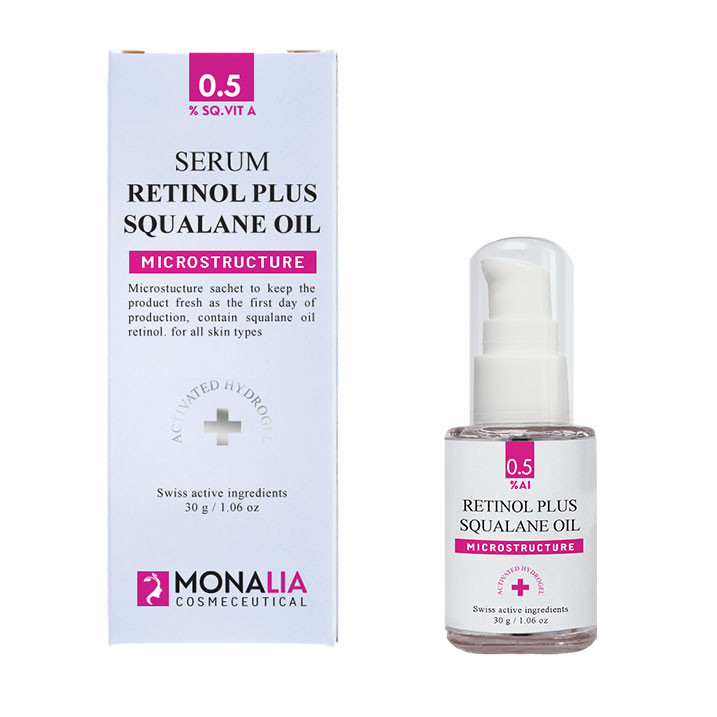 سرم رتینول اسکوالان 5/0% مونالیا دارای تکنولوژی هیدروژل فعال می باشد که اثر بخشی آن را چندین برابر می کند. این محصول دارای ساشه میکروساختار حاوی%0/5 رتینول اسکوالان، %5 نیاسین آمید، %2 روغن دانه گل رز و %5 کلاژن هیدرولیز شده که باعث می شود این محصول مثل روز اول تولید تازه استفاده شود. مواد موثره بکار رفته در این محصول بسیار با کیفیت بوده و ساخت کشور سوئیس است.